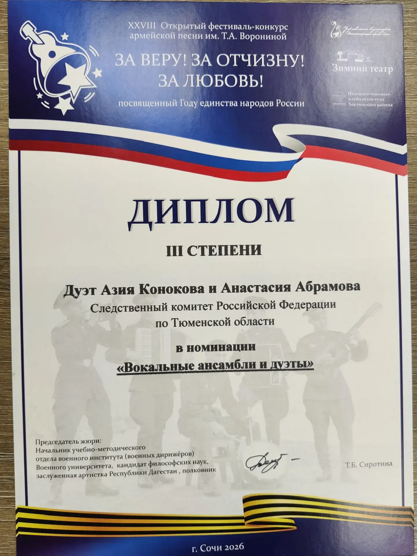 Яркое патриотическое выступление тюменского дуэта произвело сильное впечатление на присутствующих и не оставило равнодушными никого из зрителей. По итогам конкурса в номинации «Вокальные ансамбли и дуэты» Азия Конокова и Анастасия Абрамова заняли почетное третье место, став лауреатами фестиваля.