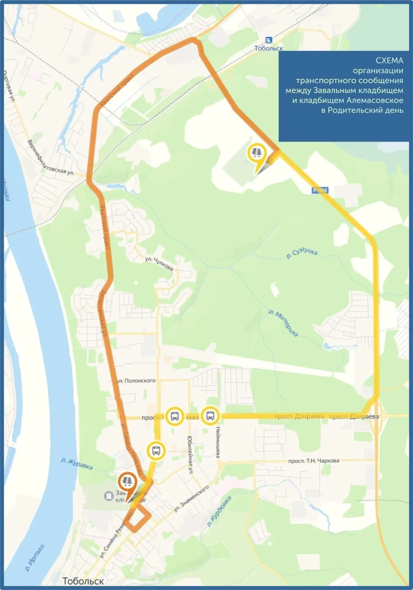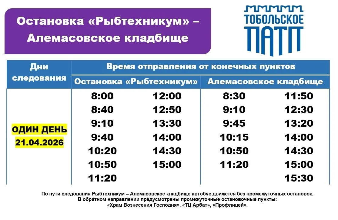 Уважаемые тоболяки и гости города! В день поминовения усопших — Родительский день 21.04.2026 г. (вторник) транспортное сообщение с местами погребений будет организовано следующим образом: