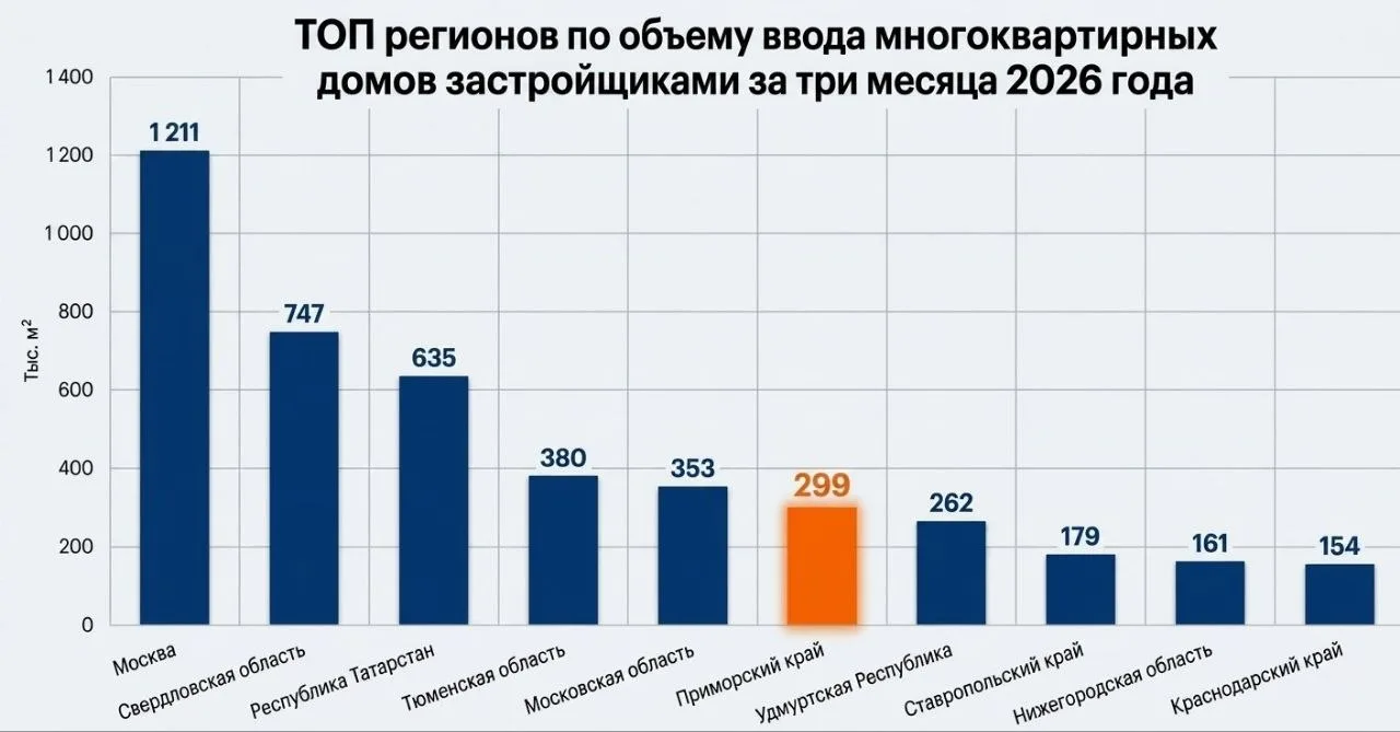 По объему введенного жилья в «квадратах» регион вошел в десятку лидеров страны, заняв 6-е место. За первые три месяца 2026 года в Приморье введено 299 тыс. кв. м многоквартирной недвижимости. Впереди Приморья — Московская и Тюменская области, Татарстан, Свердловская область и Москва.