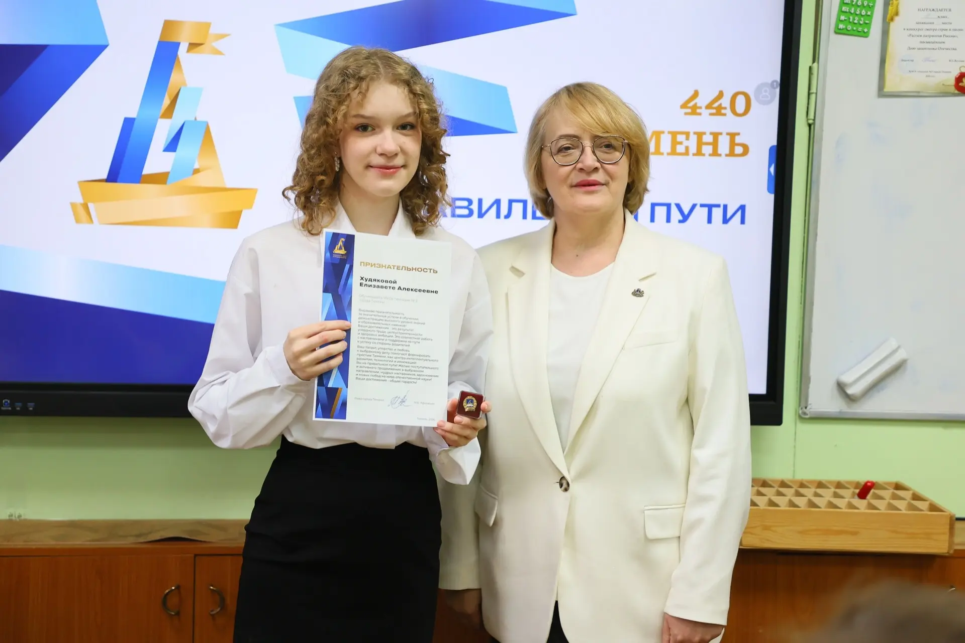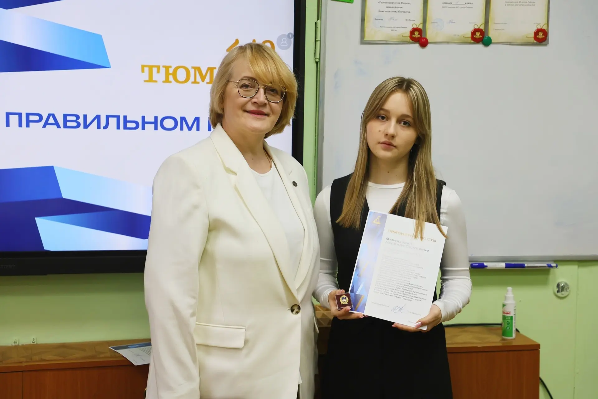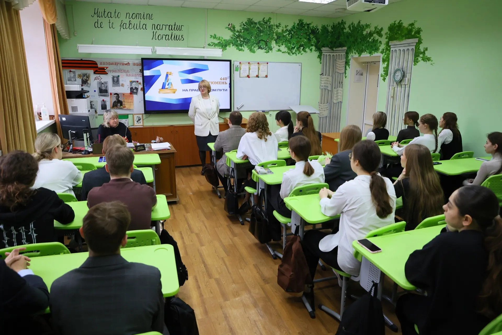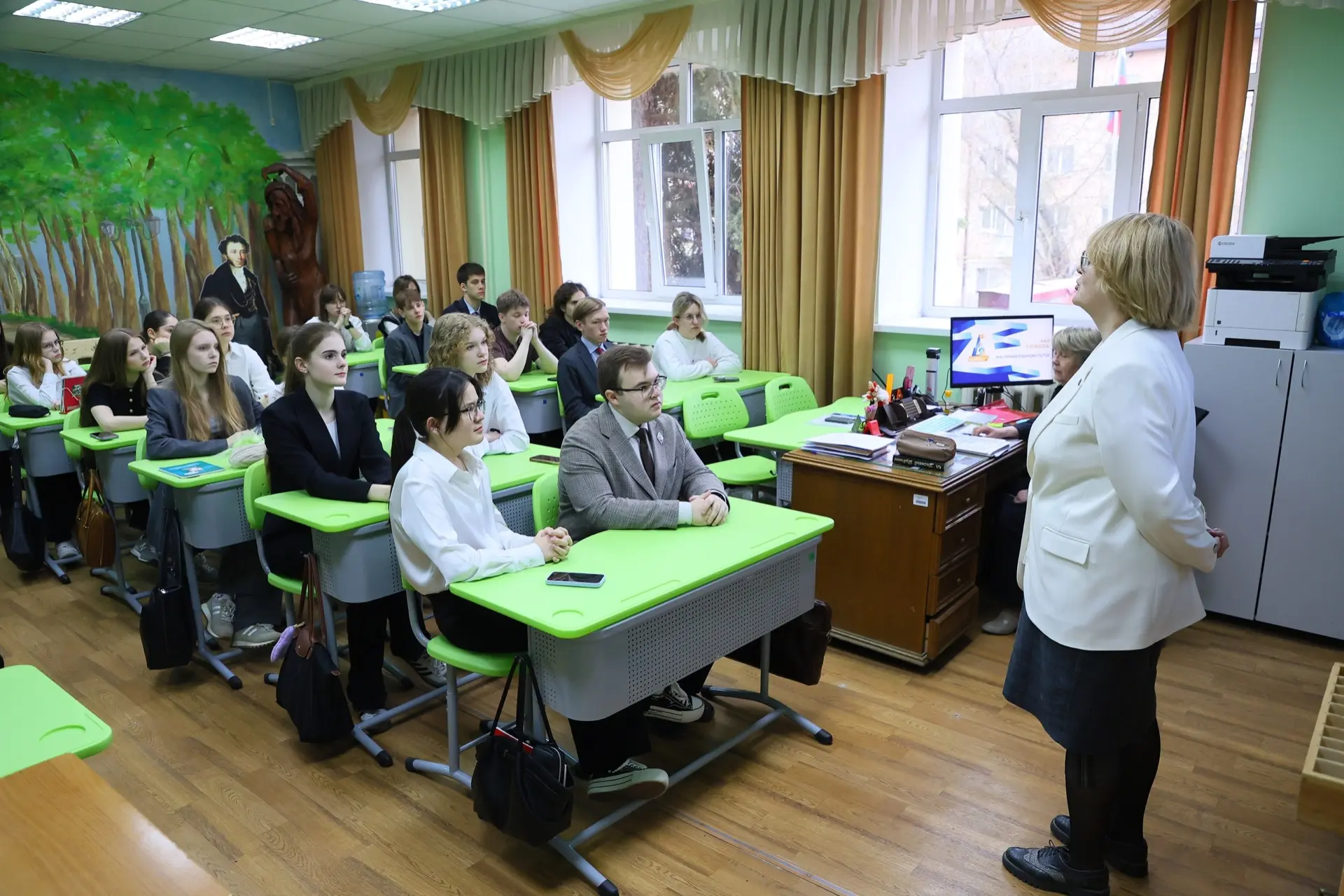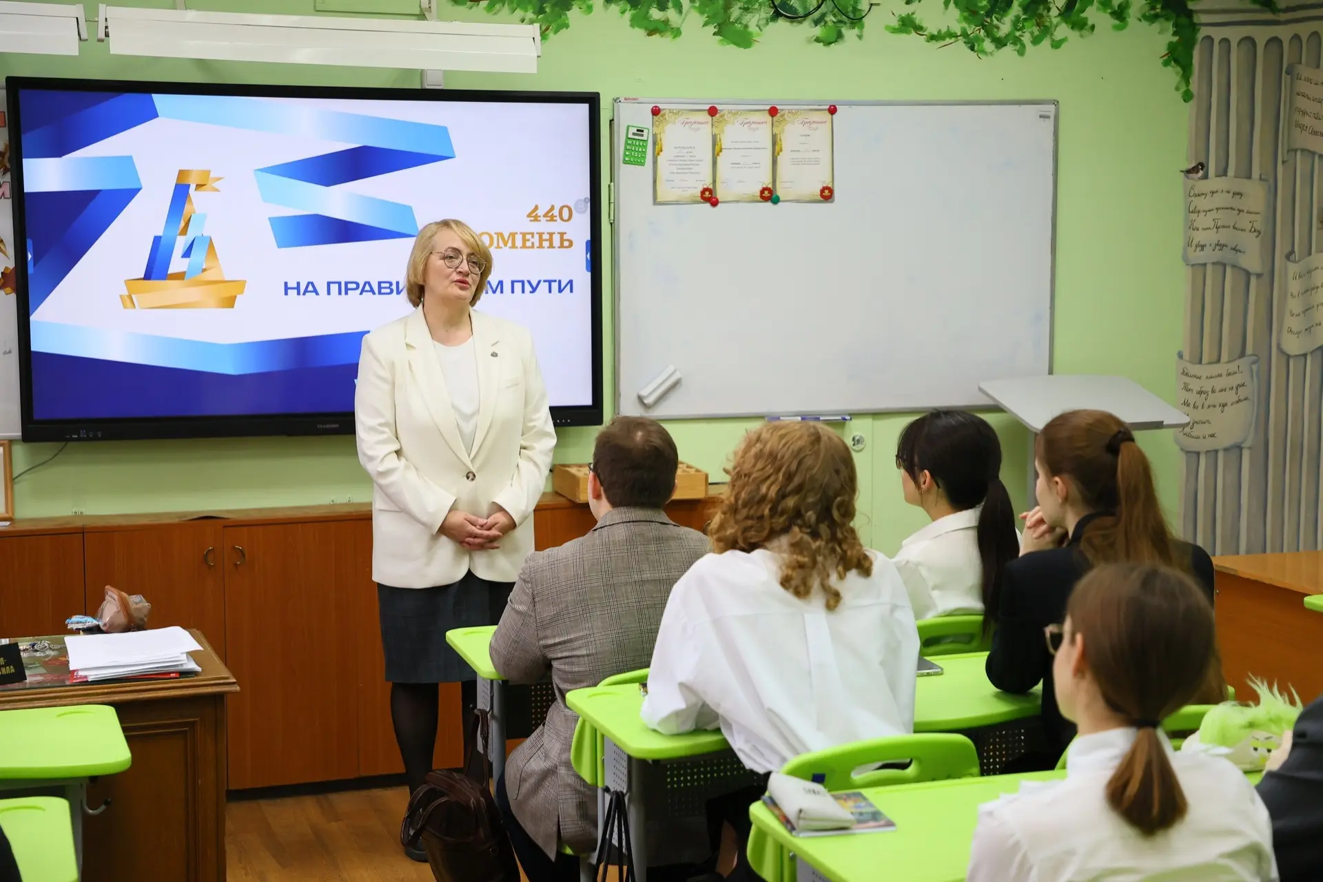 На открытом уроке почётным гостем стала директор департамента потребительского рынка администрации Тюмени Елена Михайловна Ерёмина. Она рассказала школьникам о своей профессии, последних достижениях нашего города, а также напомнила о важности гражданской позиции.
