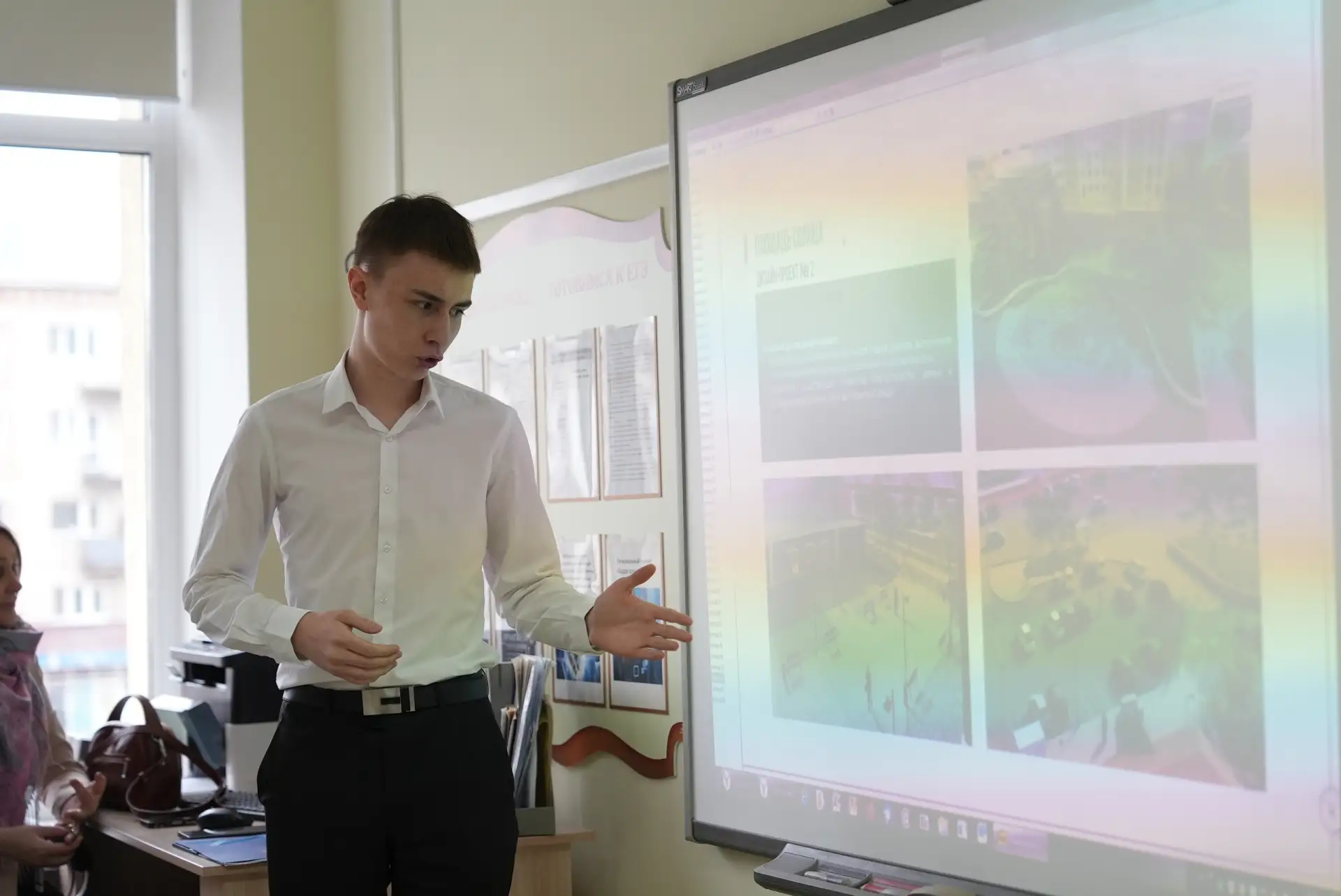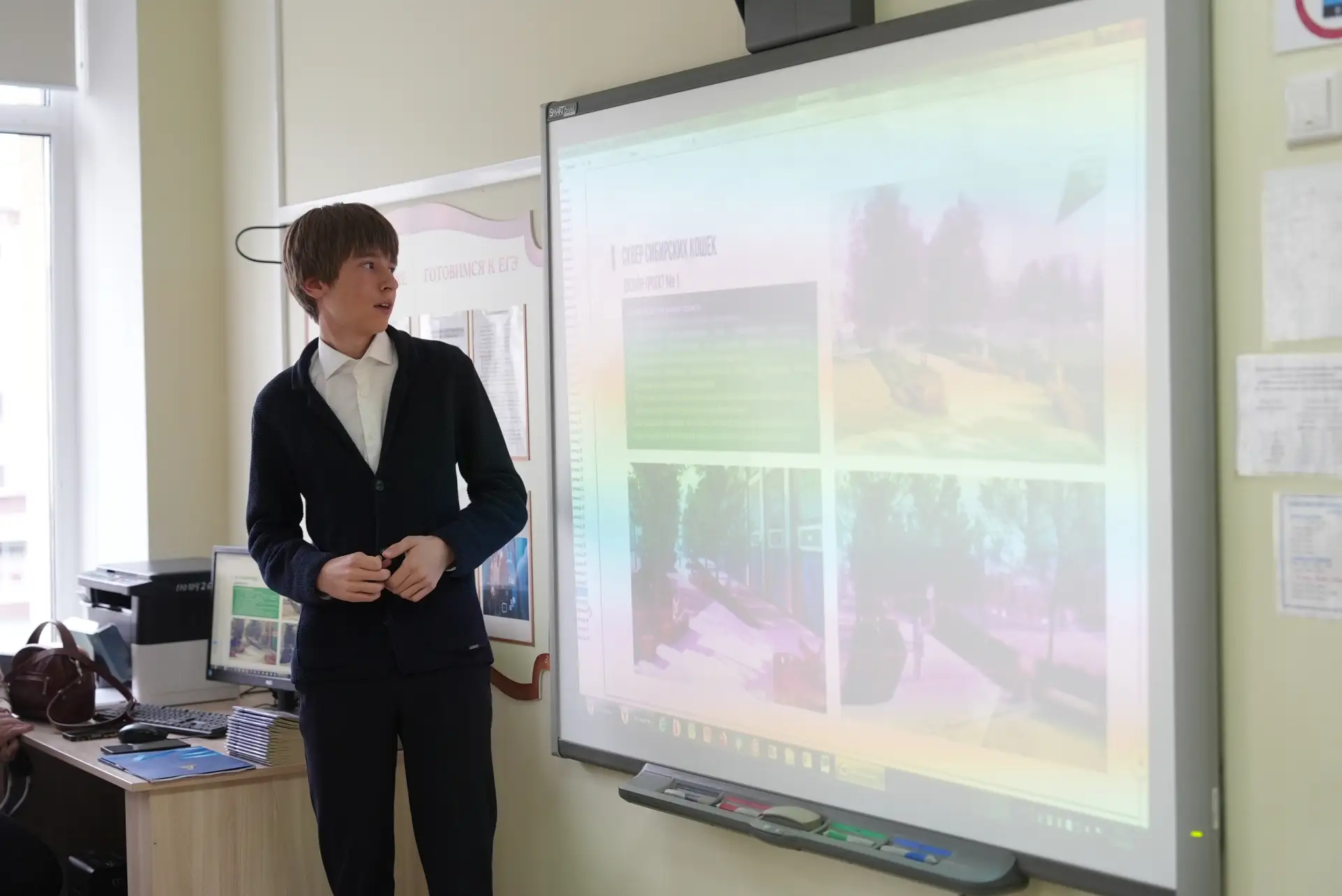 Надо сказать, что ребята подготовились основательно. Сначала они выступили с презентацией каждого проекта. Аркадий Чепкасов представил два варианта будущего для сквера Сибирских кошек. Маргарита Вотинова и Андрей Малицын – площади Солнца.