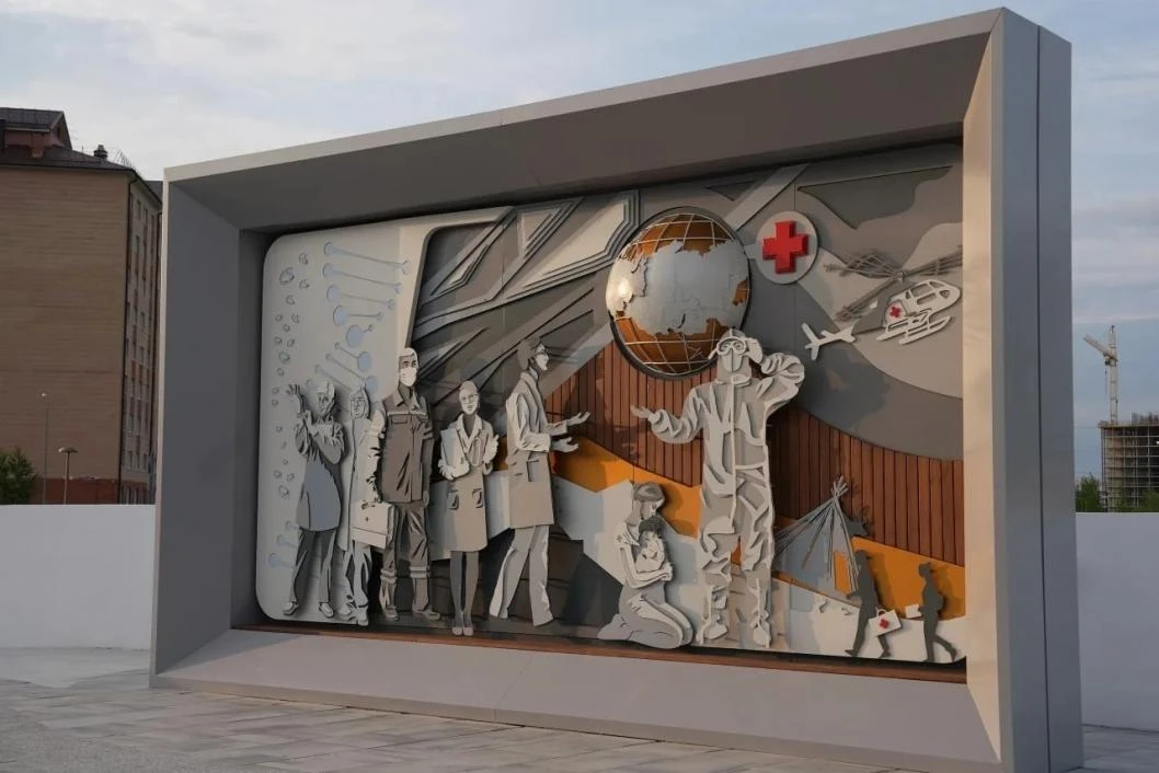 Раньше здесь был пустырь. Сейчас — современное общественное пространство со скульптурой в честь медиков. Его преобразили в рамках нацпроекта «Инфраструктура для жизни». Дизайн-проект сквер выбрали сами жители.