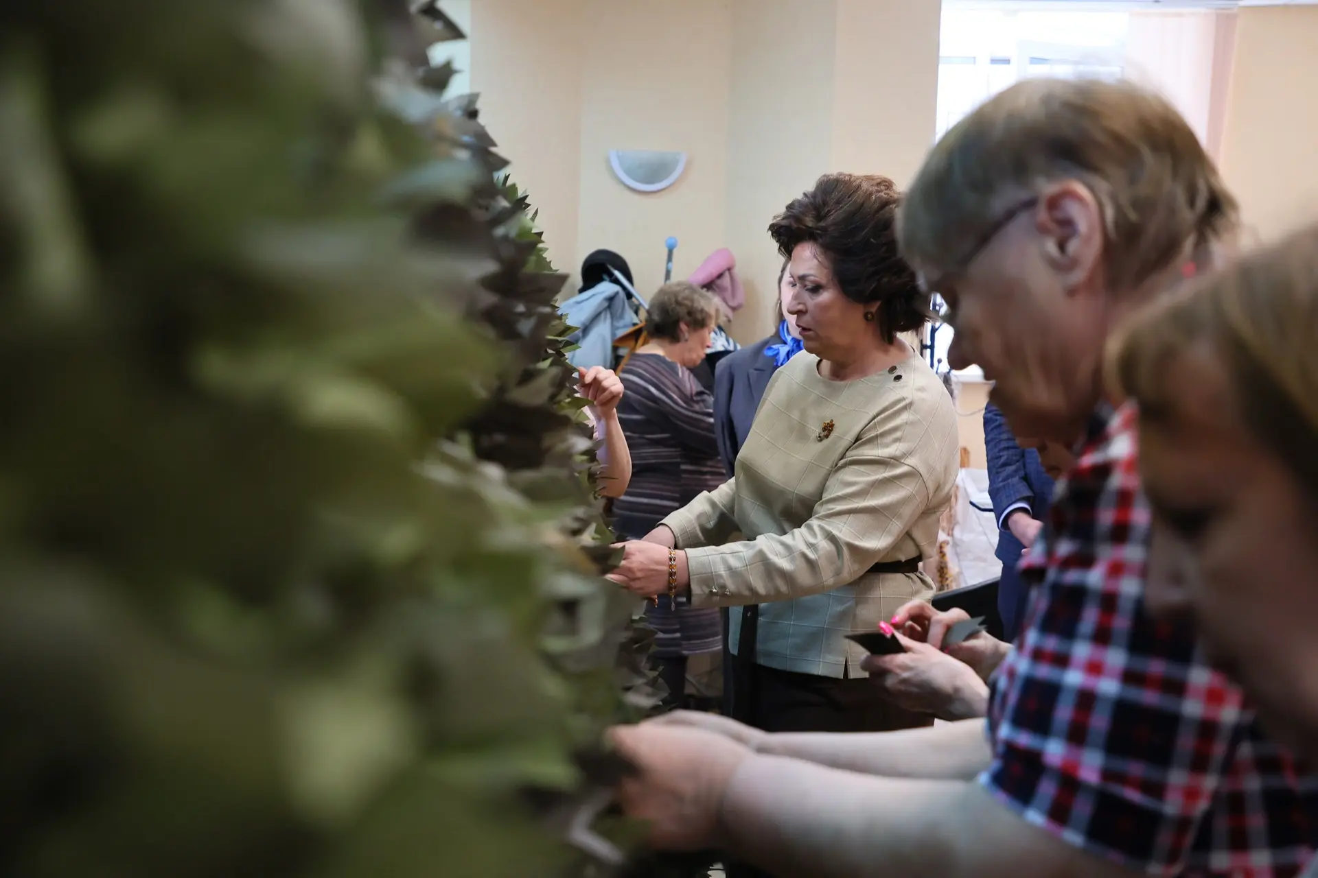 Председатель Тюменской городской думы Светлана Иванова и депутат Павел Девайкин сегодня познакомились с самым опытным добровольцем центра: 87-летней пенсионеркой Натальей Марковной Сальниковой. Она уже третий год помогает в плетении маскировочных сетей, готова и дальше вместе с «коллегами» по цеху делать общее дело и встретить свой 90-летний юбилей.