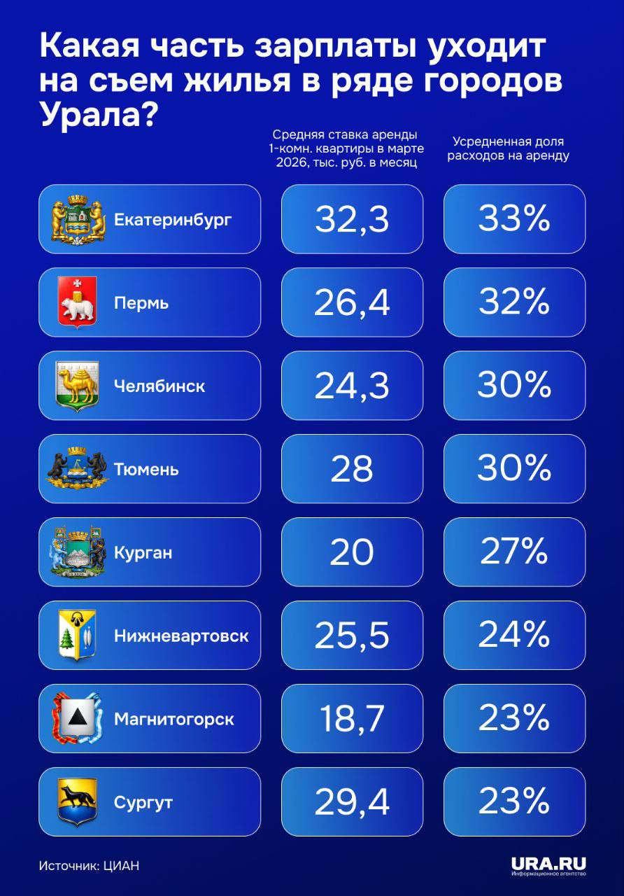 Какую часть зарплаты отдают уральцы на съем жилья? Усредненные данные для инфографики URA.RU представил онлайн-сервис ЦИАН. В Екатеринбурге в среднем жители отдают треть доходов на аренду квартиры. А в Магнитогорске и Сургуте показатель составил 23%.