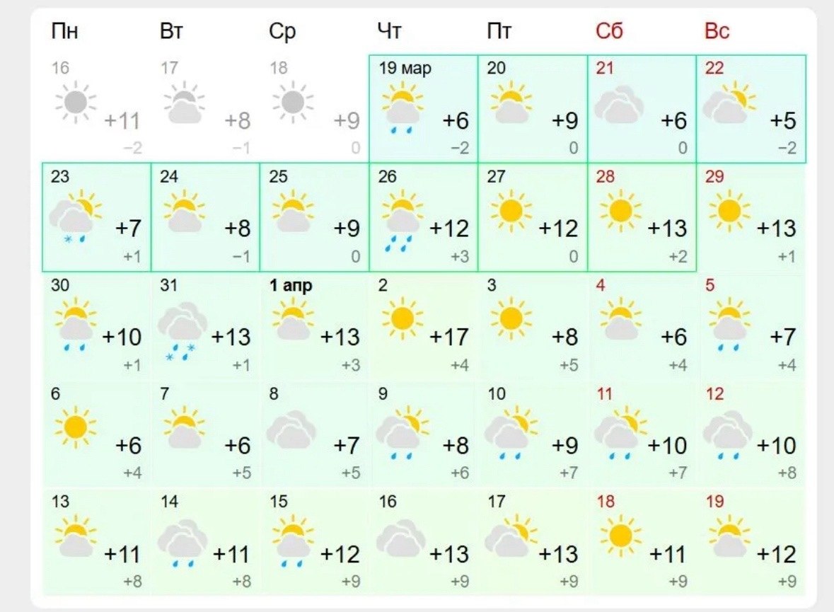Теплеть в Тюмени начнет теплеть с 26 марта. В этот день температура наружного воздуха составит 12 градусов со знаком плюс. Далее в течение шести дней будет стоять теплая погода – от +10 до +13. Пик тепла придется на второе апреля – в этот день столбики термометров покажут 17 градусов выше нулевой отметки.