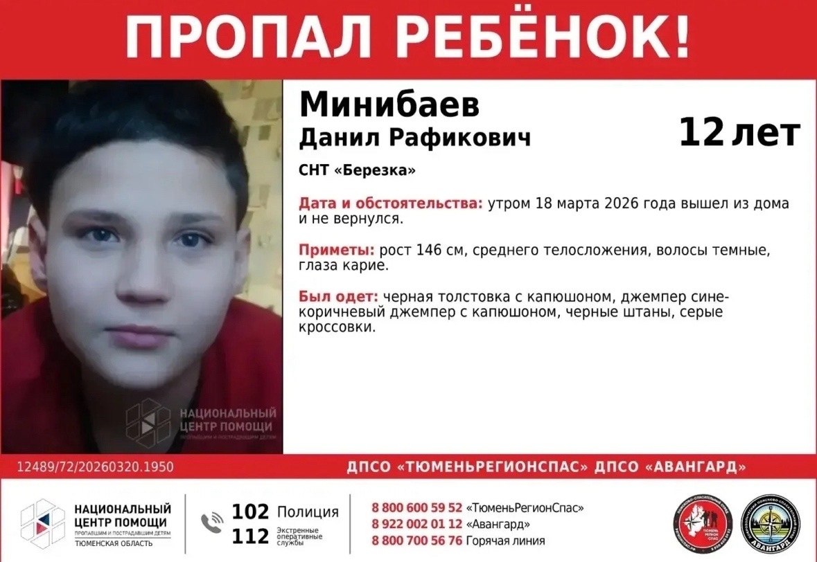 12-летний Данил Минибаев исчез в СНТ «Березка». Мальчик уже два дня не появлялся дома. Он н вышел из дома днем 18 марта, с тех пор о его местонахождении ничего неизвестно.