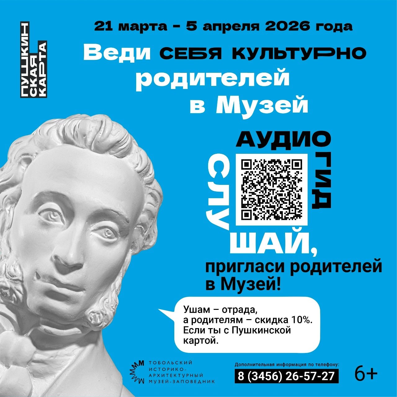 С 21 марта по 5 апреля в Тобольском историко-архитектурном музее-заповеднике пройдёт Всероссийская акция «Веди родителей в музей» для владельцев Пушкинской карты.