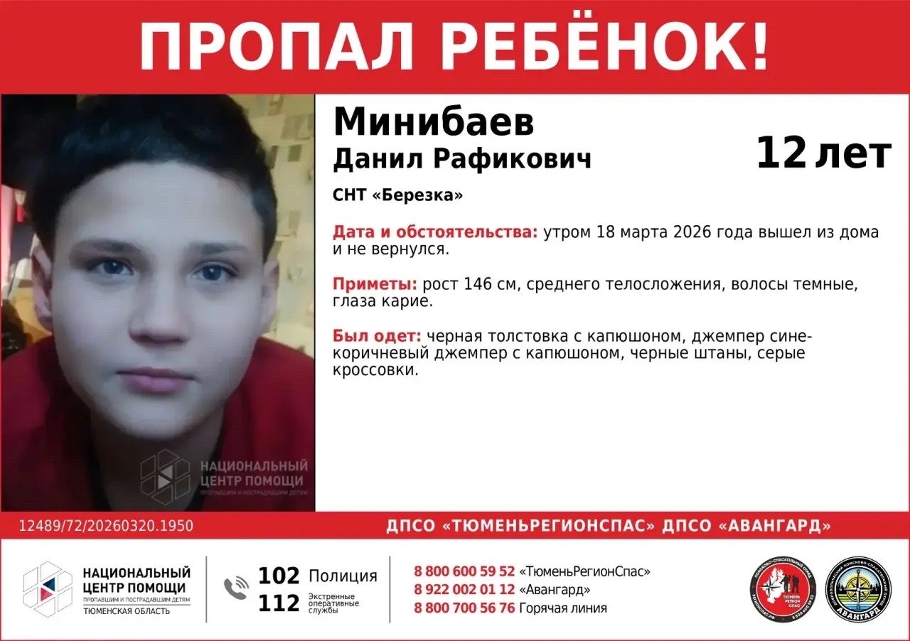 В Тюмени и области ищут 12-летнего Данила Минибаева. Утром 18 марта он вышел из дома в СНТ «Березка» и до сих пор не вернулся.