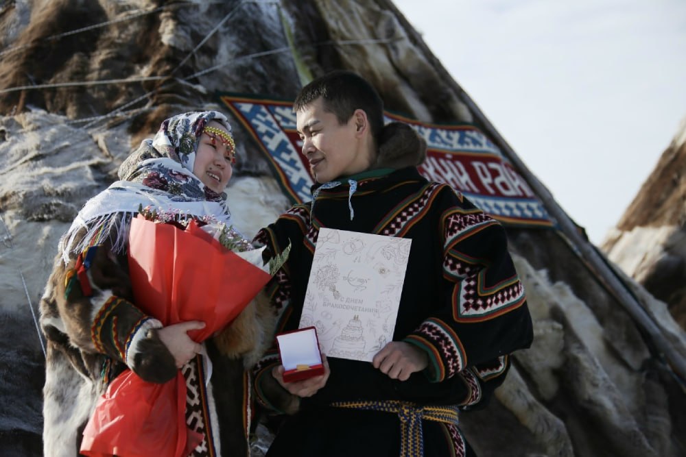 В Тазовском районе ЯНАО уже сложилась традиция регистрировать браки во время главного праздника тундровиков — Дня оленевода. Молодожены специально выбирают эту дату, чтобы объединить два торжества в один день: на пышное гулянье со всей округи съезжаются многочисленные родственники и друзья.