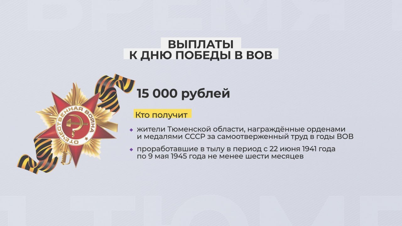 По 15 тысяч рублей получат тюменцы, награждённые орденами и медалями СССР за самоотверженный труд в годы Великой Отечественной войны и труженики тыла, проработавшие с 22 июня 1941 г. по 9 мая 1945 г. не менее полугода.