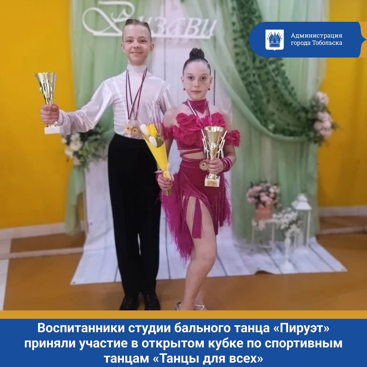 В выходные воспитанники студии бального танца «Пируэт» Центра искусств и культуры Тобольска под руководством Ирины Мацук приняли участие в открытом кубке по спортивным танцам «Танцы для всех» в г. Тюмень.