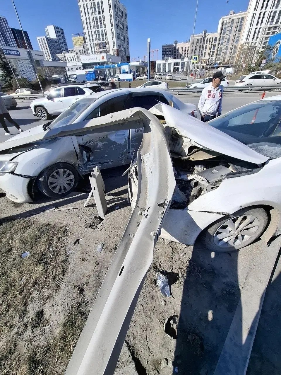 Автомобиль такси протаранил отбойник на мосту Мельникайте: по данным сети, аварию спровоцировал таксист с пассажиром в авто