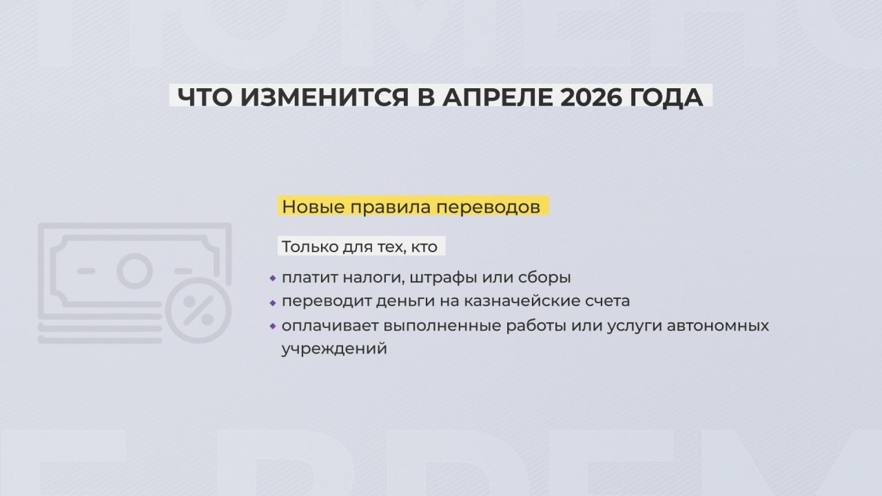 - С 1 апреля вступят в силу новые правила переводов, но они коснутся только тех, кто оплачивает налоги, штрафы, переводит деньги на казначейские счета или оплачивает выполненные работы. Изменения не затронут платежи между физлицами.