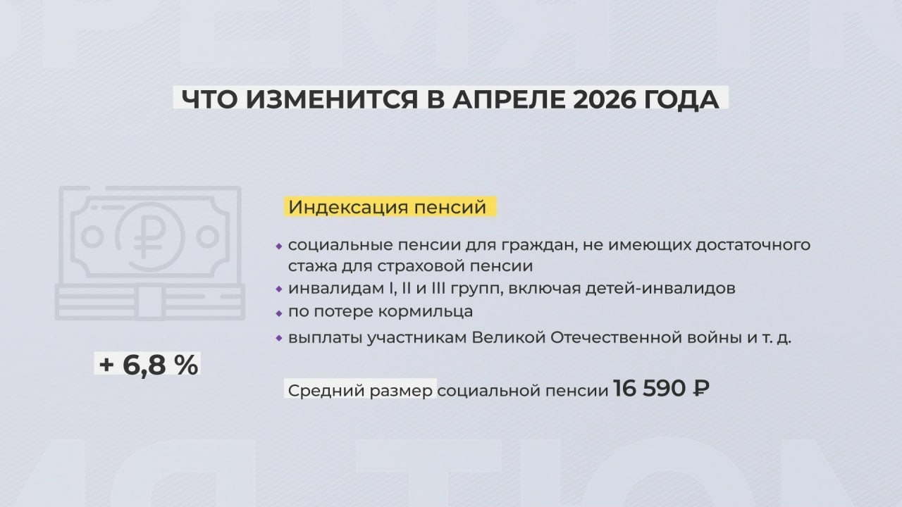 - На 6,8 % увеличатся социальные пенсии. Повышение коснётся тех, кто не накопил необходимый стаж работы, а также инвалидов и участников ВОВ. Средний размер выплаты после индексации достигнет 16,5 тысячи рублей.