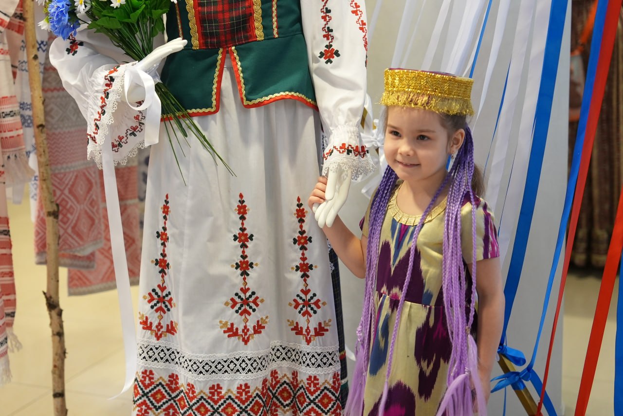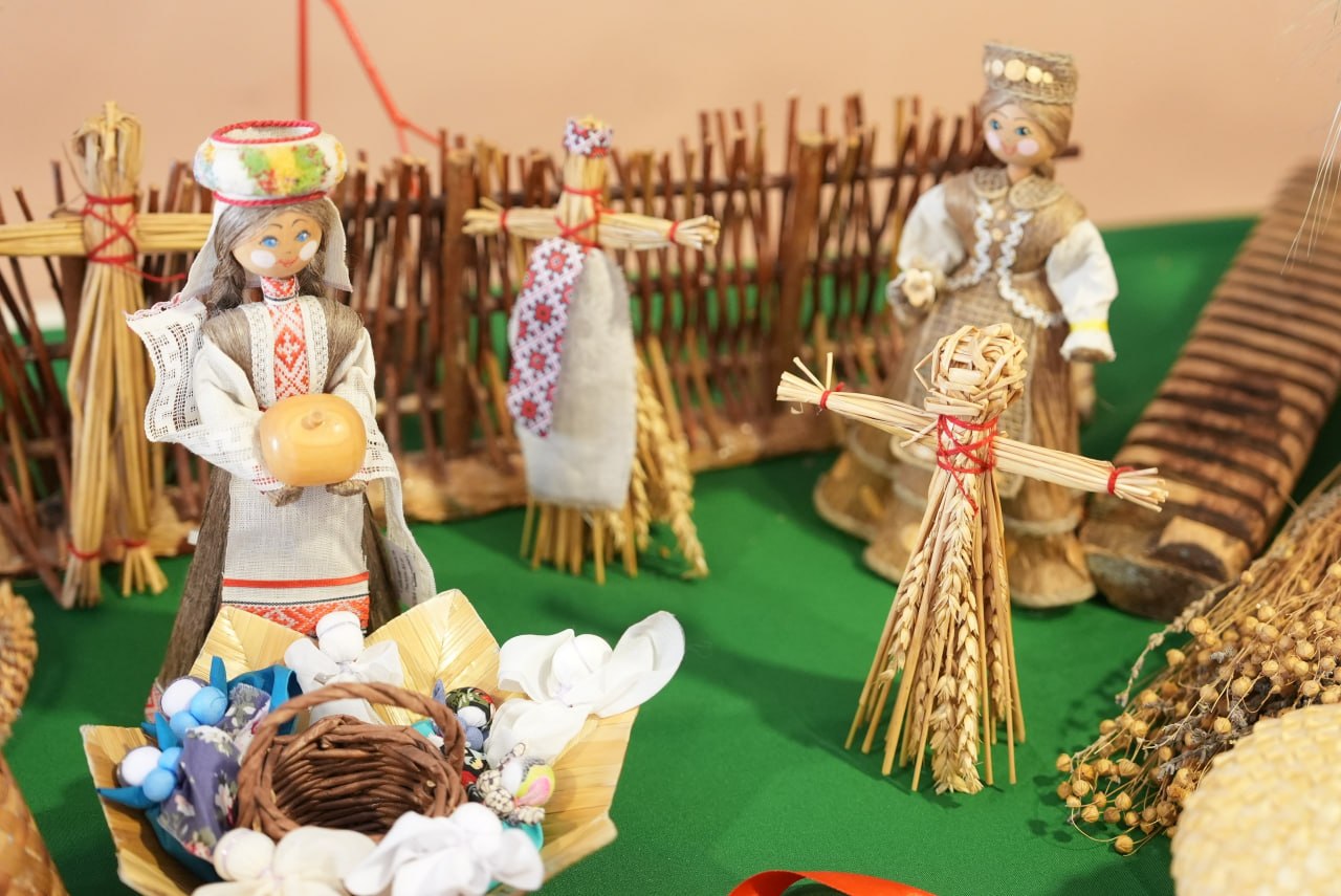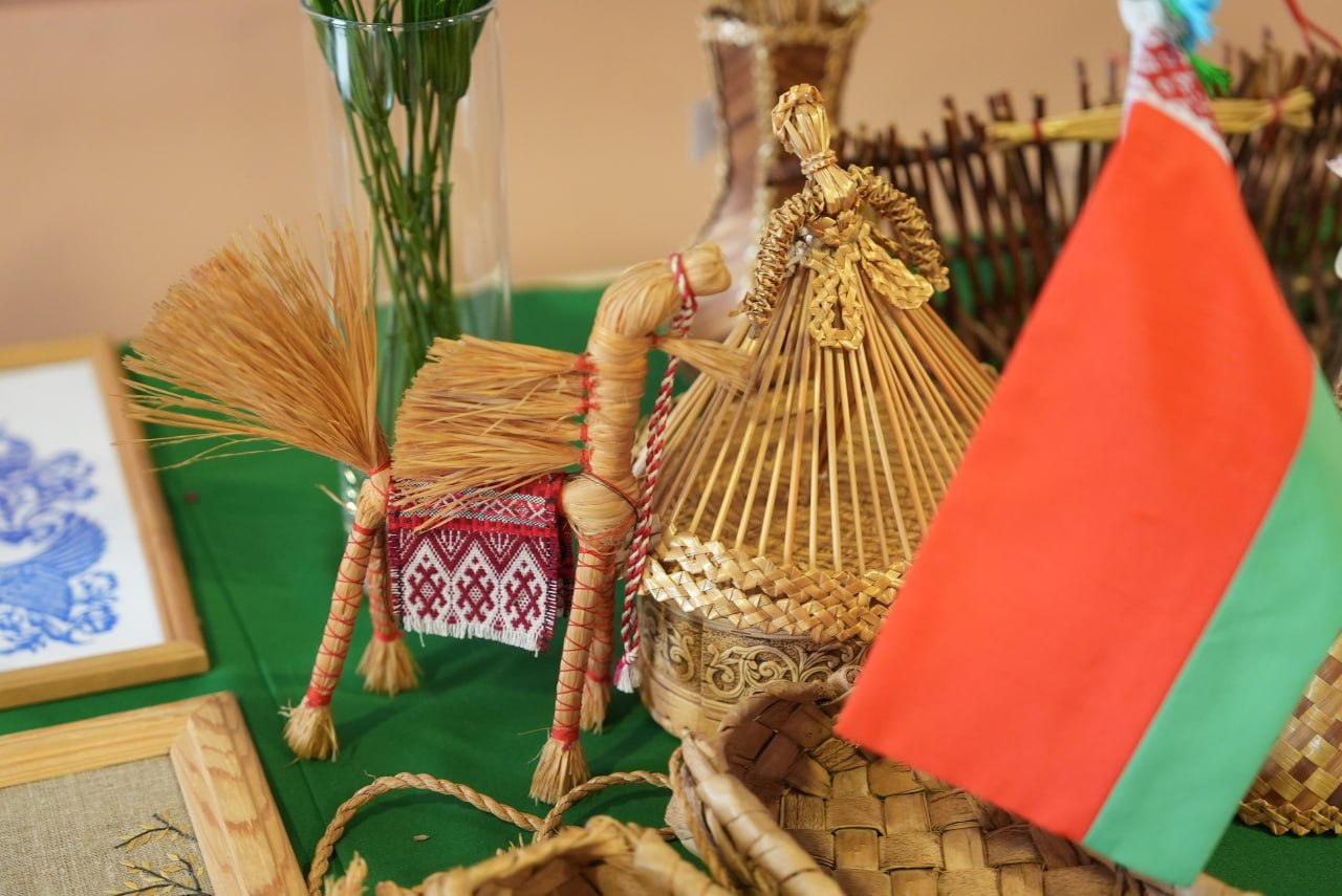 Можно было увидеть предметы быта и народного творчества. Чего только стоила фотозона из лент, где в буквальном смысле сплелись два наших флага, или начатый в ткацком станке половичок в цветах брендбука юбилейного Дня города. Были там и рушники с белорусскими орнаментами, выцинанки, плетённые из соломы посуда, игрушки, кокошники и, конечно, блюда национальной кухни, например, любимые многими драники.