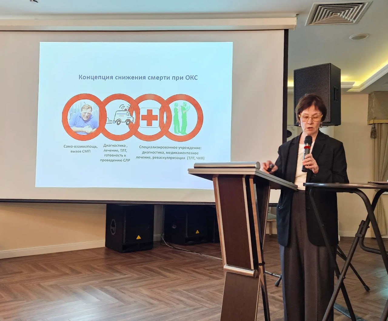 Она обратила внимание на высокую роль скорой медицинской помощи в спасении пациентов с сердечно-сосудистыми заболеваниями. Фельдшеры записывают ЭКГ, ставят диагноз и принимают решение о тактике реперфузионной терапии – тромболитической терапии на месте или транспортировке в стационар на первичное чрескожное коронарное вмешательство.