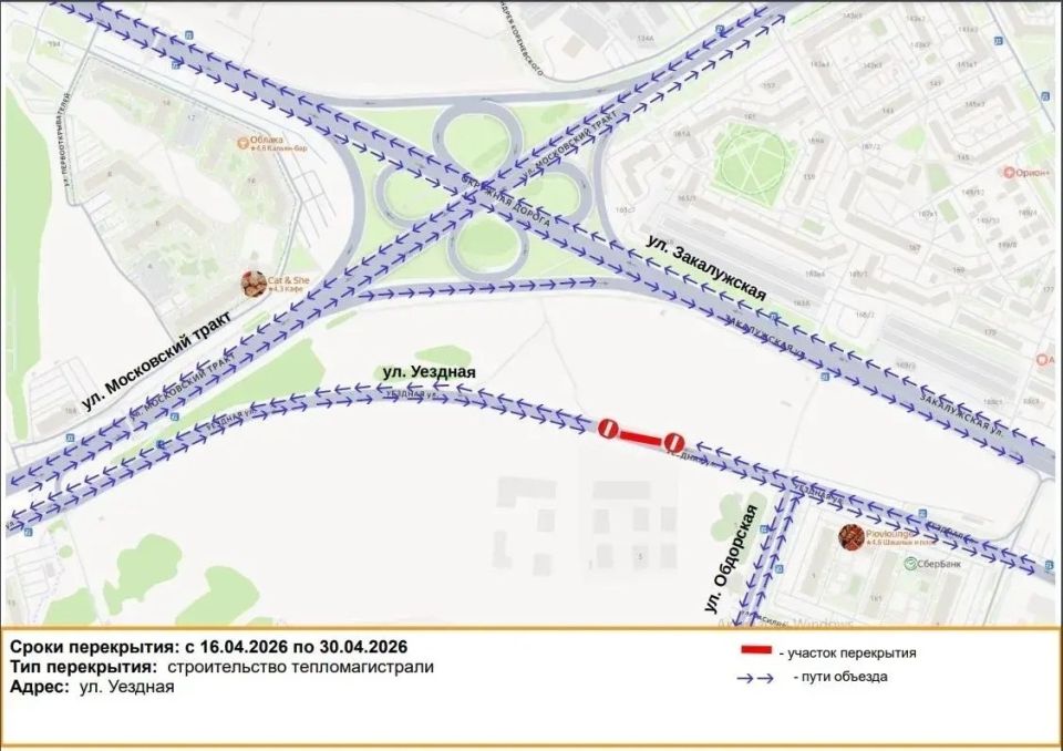 С 16 по 30 апреля улица будет закрыта для проезда. Объехать участок можно по улицам Обдорской, Закалужской и Московскому тракту. Водителей просят заранее планировать маршрут, обращать внимание на знаки и соблюдать ПДД.
