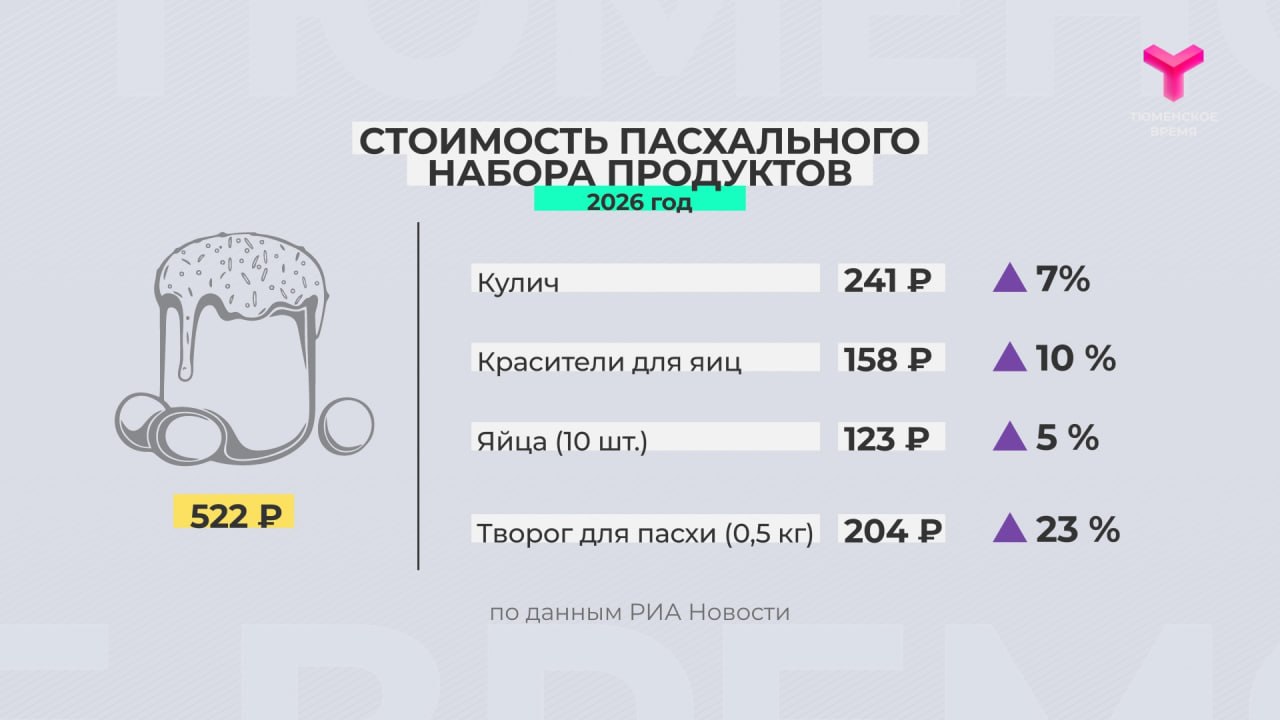 Такие данные публикует РИА Новости. В эту сумму входят готовый кулич, десяток яиц и красители. По данным аналитиков, средний чек за кулич за год увеличился в среднем на 7 %. Красители для яиц обойдутся примерно в 160 рублей, яйца в 123 рубля. Если к набору добавить творожную пасху, то стоимость увеличится примерно на 204 рубля. Столько сейчас в среднем стоит полкило творога.