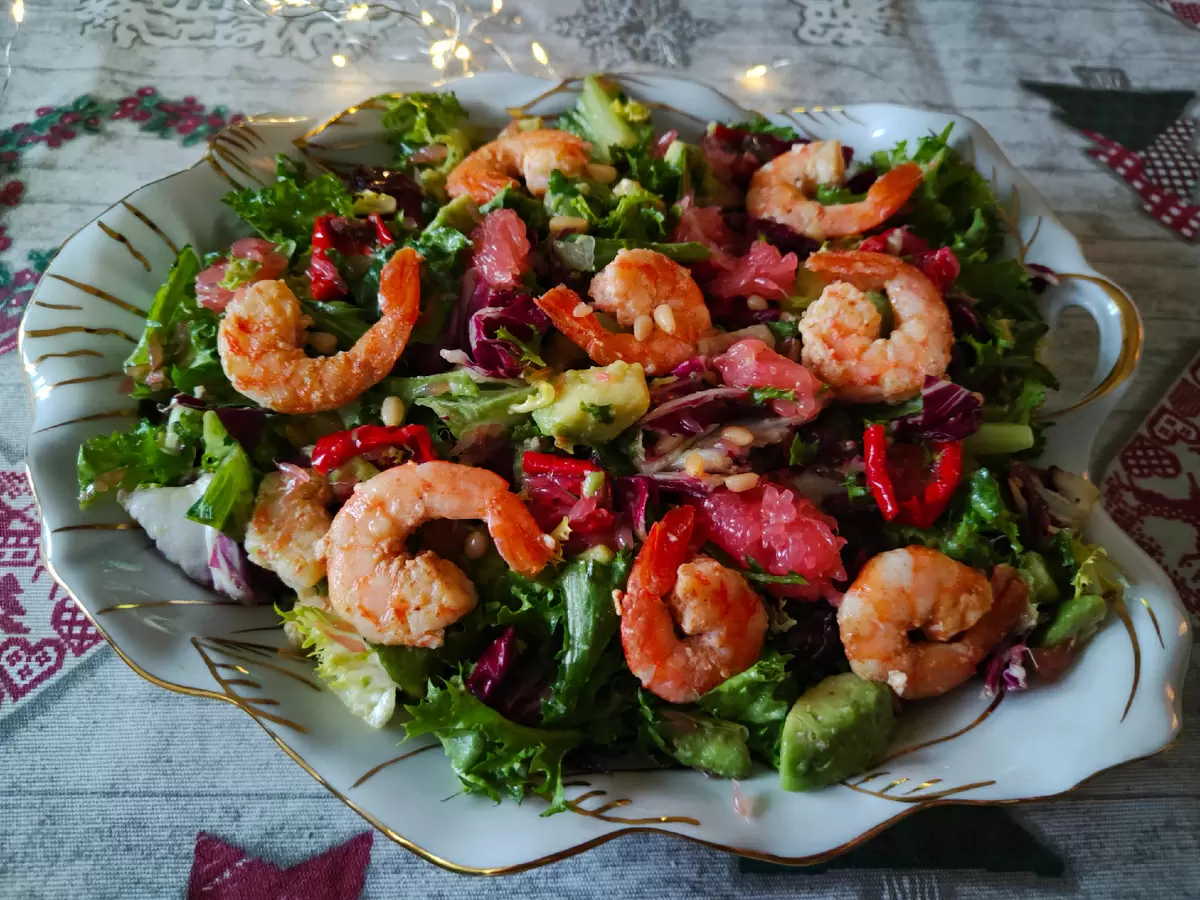 В начале трапезы был подан салат с креветками, авокадо и грейпфрутом. Это изысканное сочетание не только ярко выглядит, но и отлично сочетает в себе вкус и пользу. Салат привлек внимание благодаря свежести ингредиентов, наполненных витаминами.