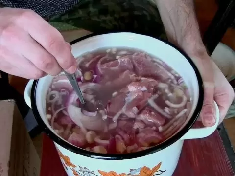 Мясо нарезается на крупные кусочки, чтобы можно было удобно насаживать на шампур. В небольшой емкости комбинируются соль, перец, уксус и вода, которые тщательно перемешиваются до полного растворения соли. Затем получившуюся маринаду выливаем к мясу и луку.