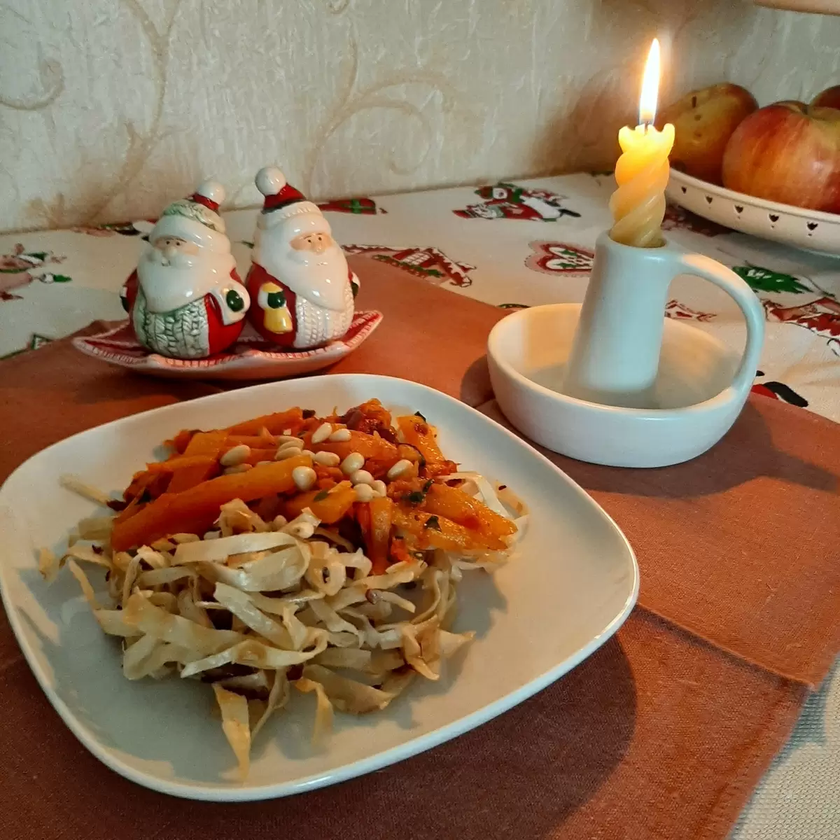 Уникальная интерпретация пасты - тонко нарезанный лаваш в сочетании с необыкновенно легкой тыквенной заправкой, причем этот соус вовсе не имеет навязчивого тыквенного вкуса. Итогом становятся хрустящие и ароматные кусочки, которые идеально подойдут для общения в кругу семьи или друзей.