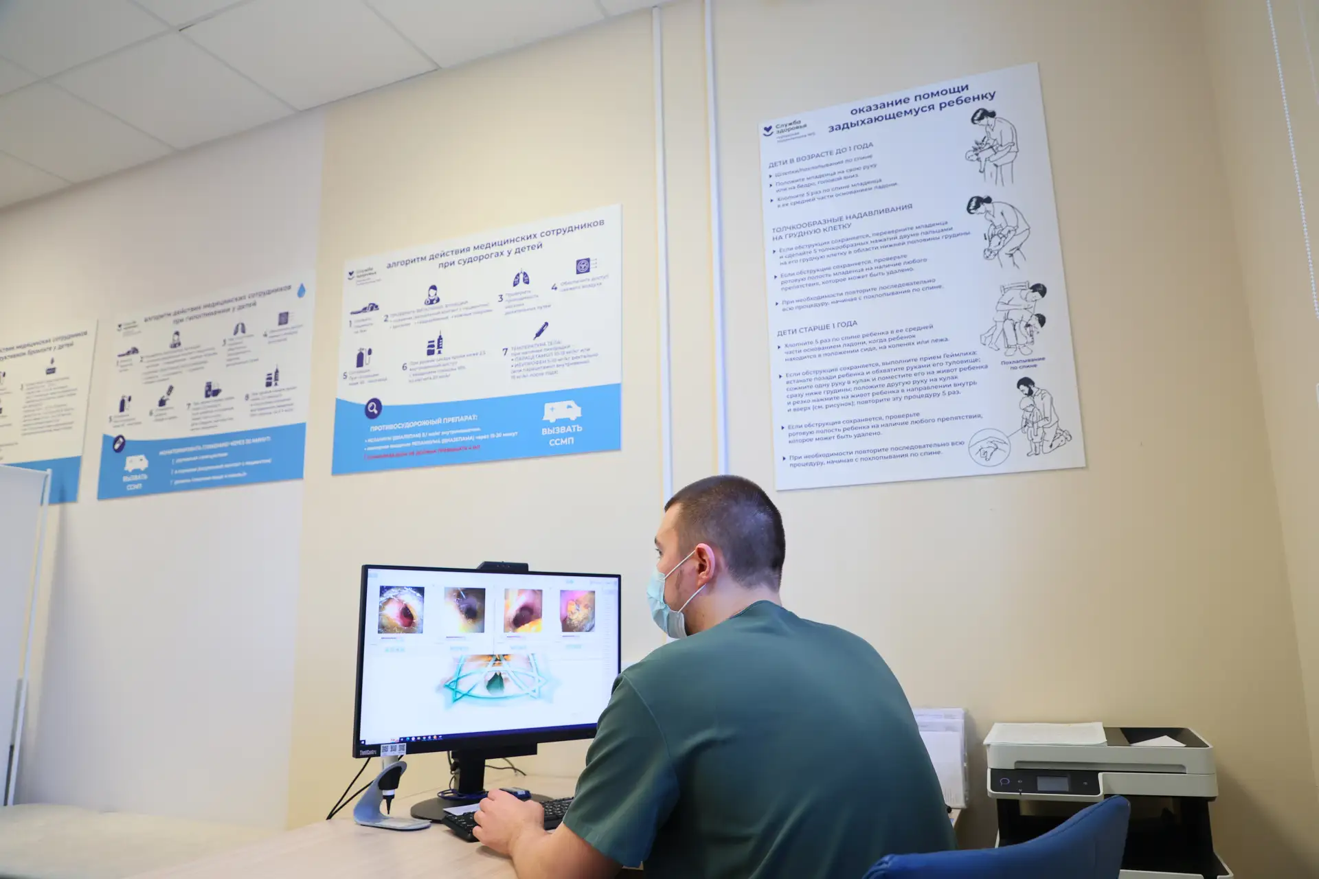 В главном корпусе 5-й поликлиники работает отделение неотложной помощи детскому населению. Оно работает с 7 до 24 часов по принципу приемного отделения областной больницы, также врачи принимают маленьких пациентов со всей Тюмени. Детей консультируют не только педиатры, но и узкие специалисты: подключаются травматологи, хирурги. Например, педиатр может с помощью отоскопа посмотреть ухо и передать результат лор-врачу, который проконсультирует пациента в онлайн режиме.