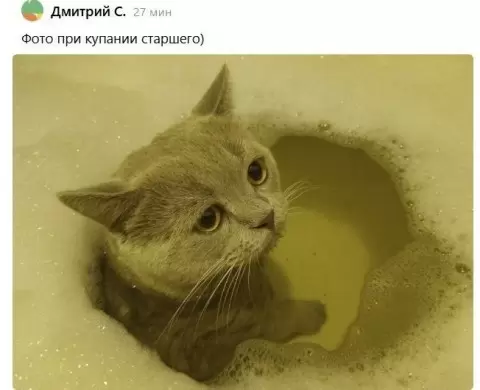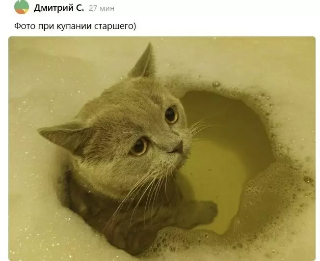 Дмитрий не растерялся и направил своего пушистого друга в ванну. Первое купание стало для кота необычным опытом: он с недоумением смотрел на своего владельца большими глазами, словно спрашивая: "Зачем это все?"