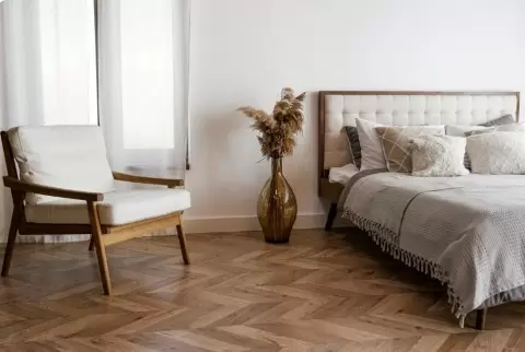 Если ламинат в стиле ёлочка кажется слишком рискованным выбором, стоит обратить внимание на пробковые полы. Они могут имитировать ёлочку и укладываться как на клей, так и с замком. Такое покрытие предлагает комфорт и тепло, что делает его отличным вариантом для жилых помещений, где важны мягкость и натуральные материалы. При этом пробковая укладка остается более технологичной и удобной, чем ламинат с замками, что всегда увеличивает её привлекательность.