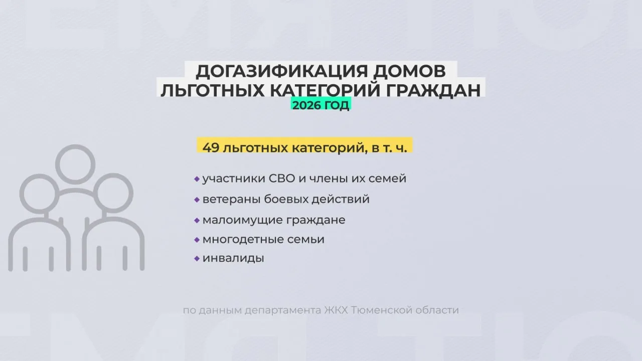 В этом году господдержкой на догазификацию смогут воспользоваться не менее 2 000 жителей, которые относятся к 49 льготным категориям. В их числе участники СВО и многодетные семьи. Газовые сети до границ участка доводят бесплатно.
