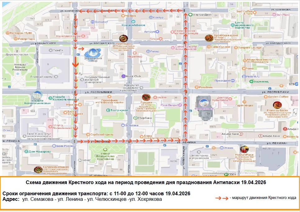 19 апреля в центральной части города Тюмени, в квадрате улиц Семакова – Ленина – Челюскинцев – Хохрякова, планируется ограничить движение транспортных средств для проведения Крестного хода в день празднования Антипасхи. Начало шествия – в 11 часов.