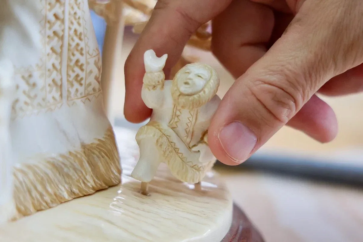 Сегодня мастерская – уже семейное дело. Рядом с родителями работает сын. В ход идут бивень мамонта и лосиный рог. Одна из работ Ольги, посвящённая коренным малочисленным народам в прошлом году взяла 2-е место на международной выставке-ярмарке «Сокровища Севера».