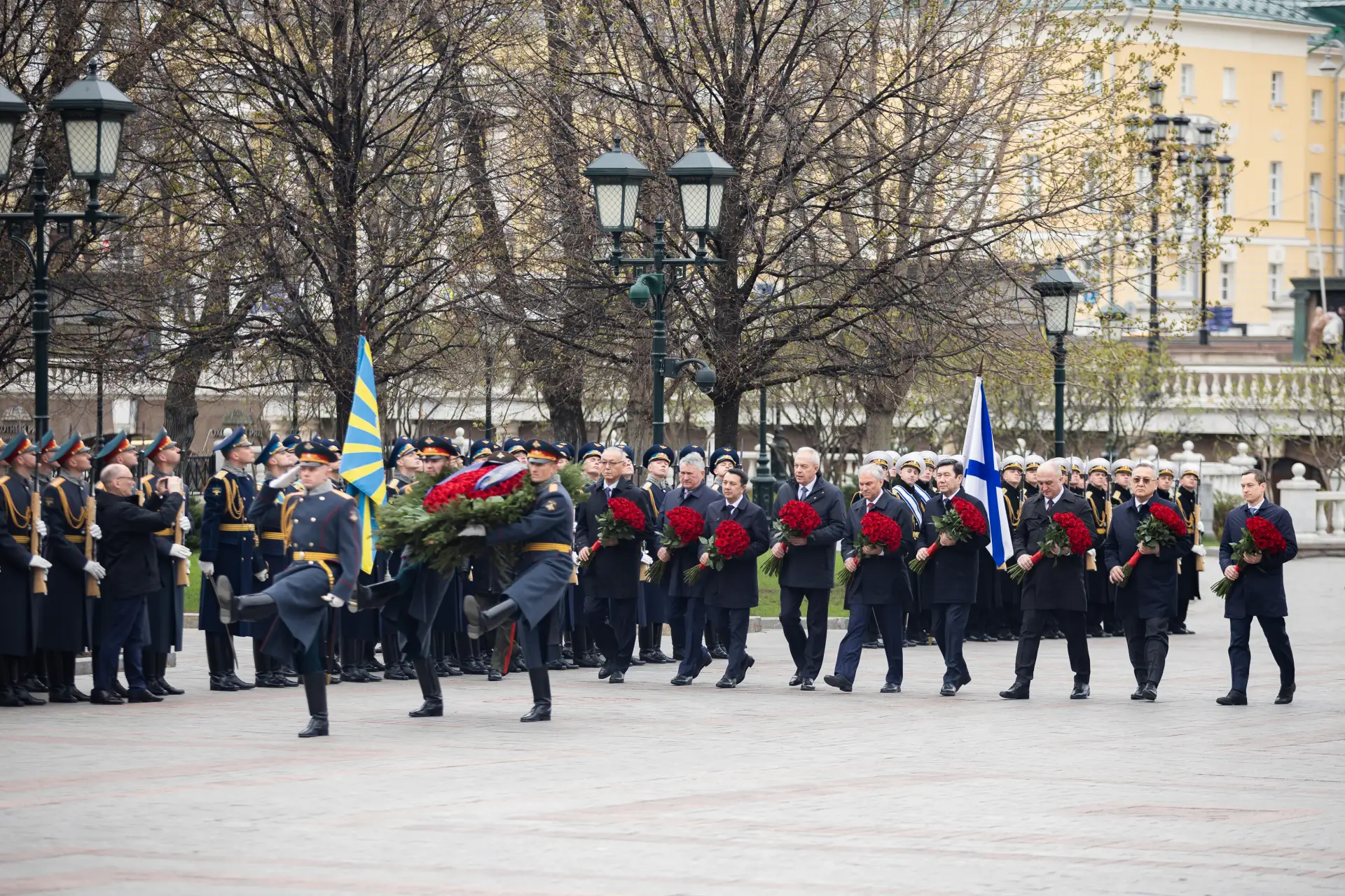 В преддверии заседания состоялась церемония возложения венка и цветов к Могиле Неизвестного Солдата в Александровском саду. Участники почтили память воинов, отдавших свои жизни за свободу Родины, минутой молчания.