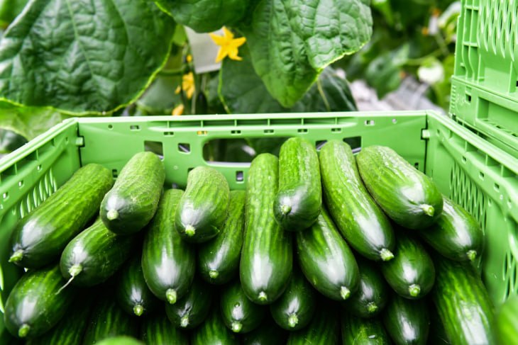 Более половины всего объема занимают огурцы - 53 %. Томаты в общей массе урожая занимают 45 %, салаты - 2 %.