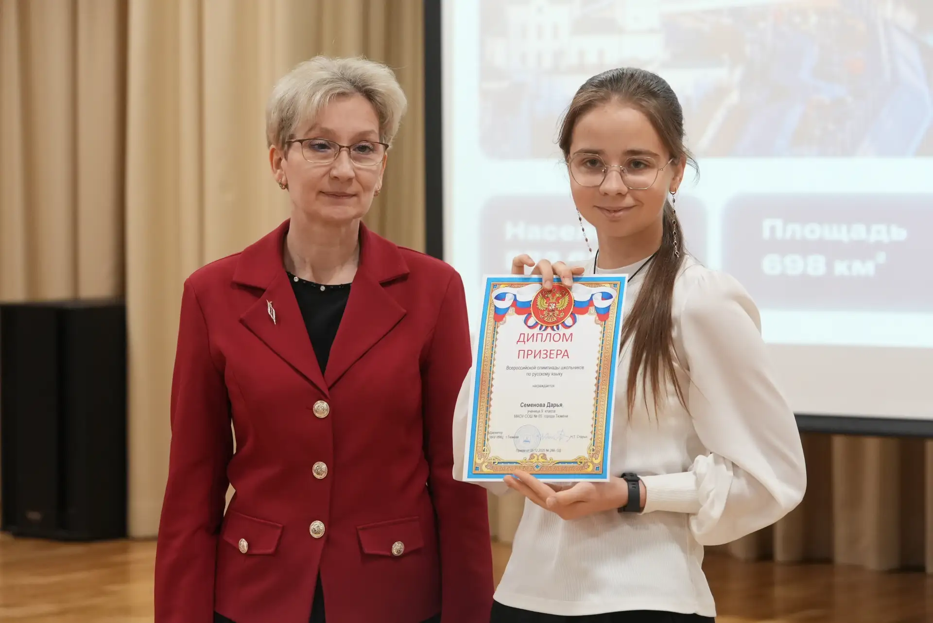 Оксана Леонидовна вручила ребятам дипломы призёров Всероссийской олимпиады школьников по различным дисциплинам, а также признательности и значки стипендиатов главы Тюмени. Также Благодарственное письмо губернатора Тюменской области получила Елена Поклонцева, которая назвала эту награду общей командной заслугой учеников и педагогов «самой замечательной школы мира».