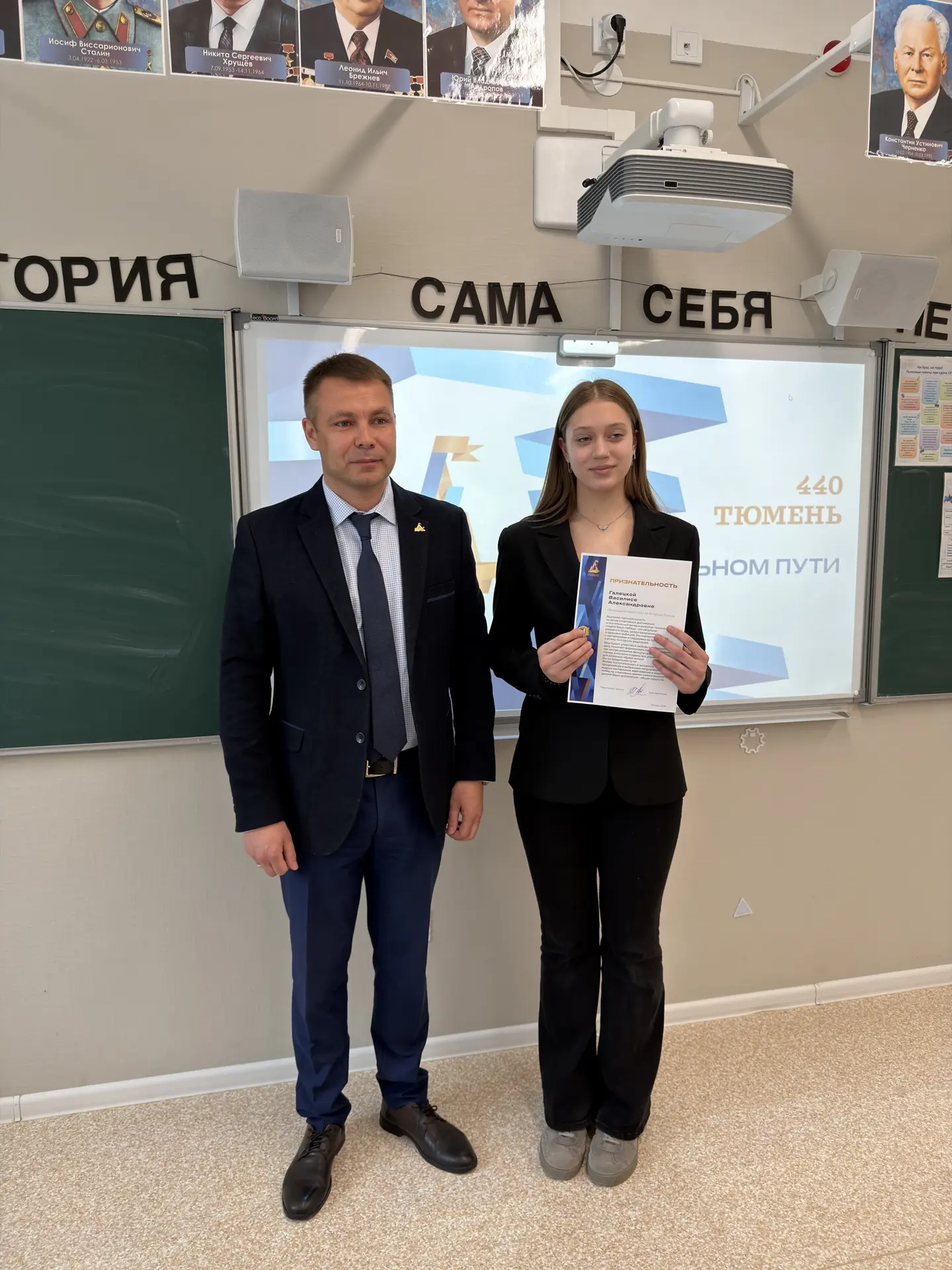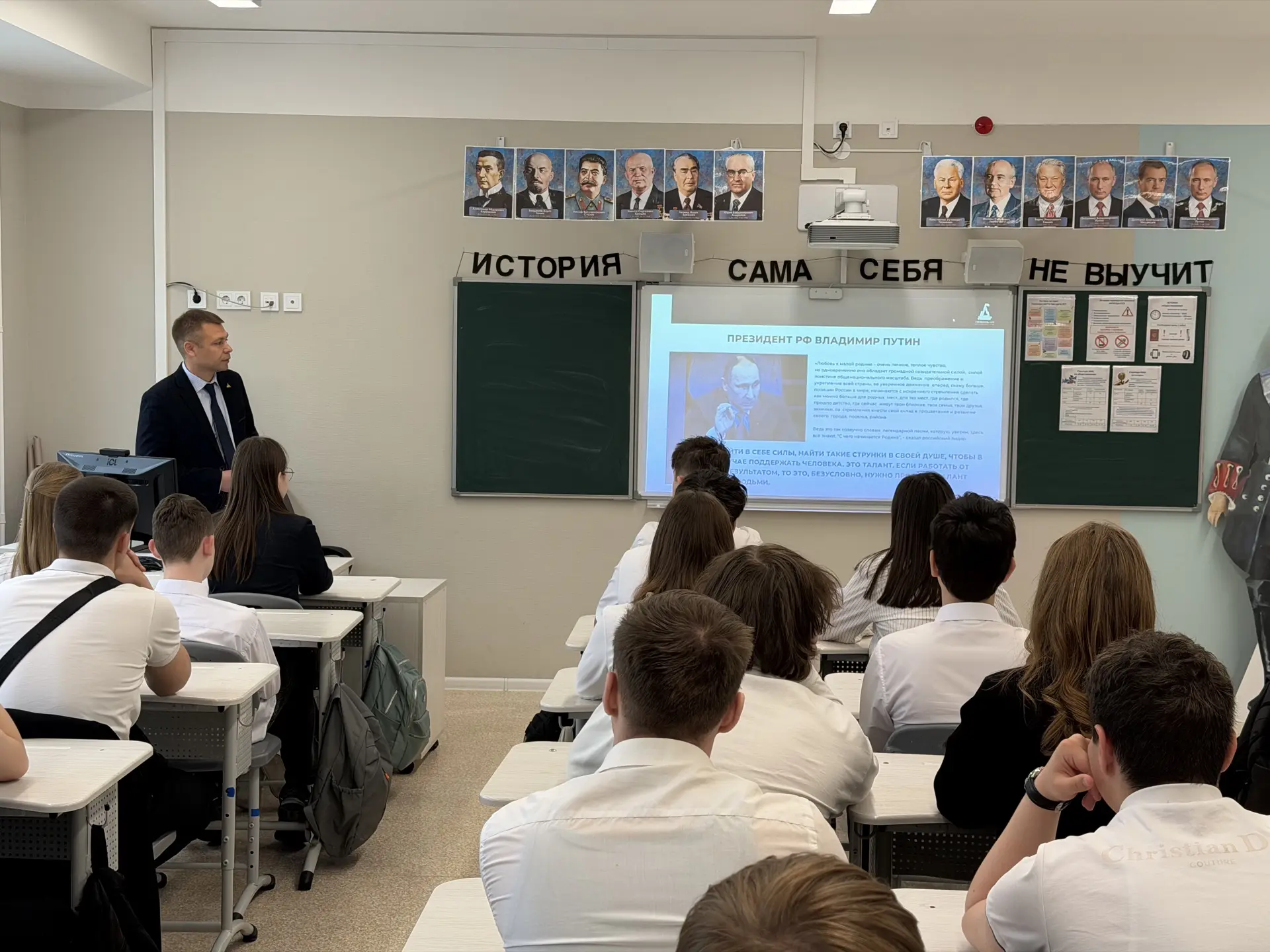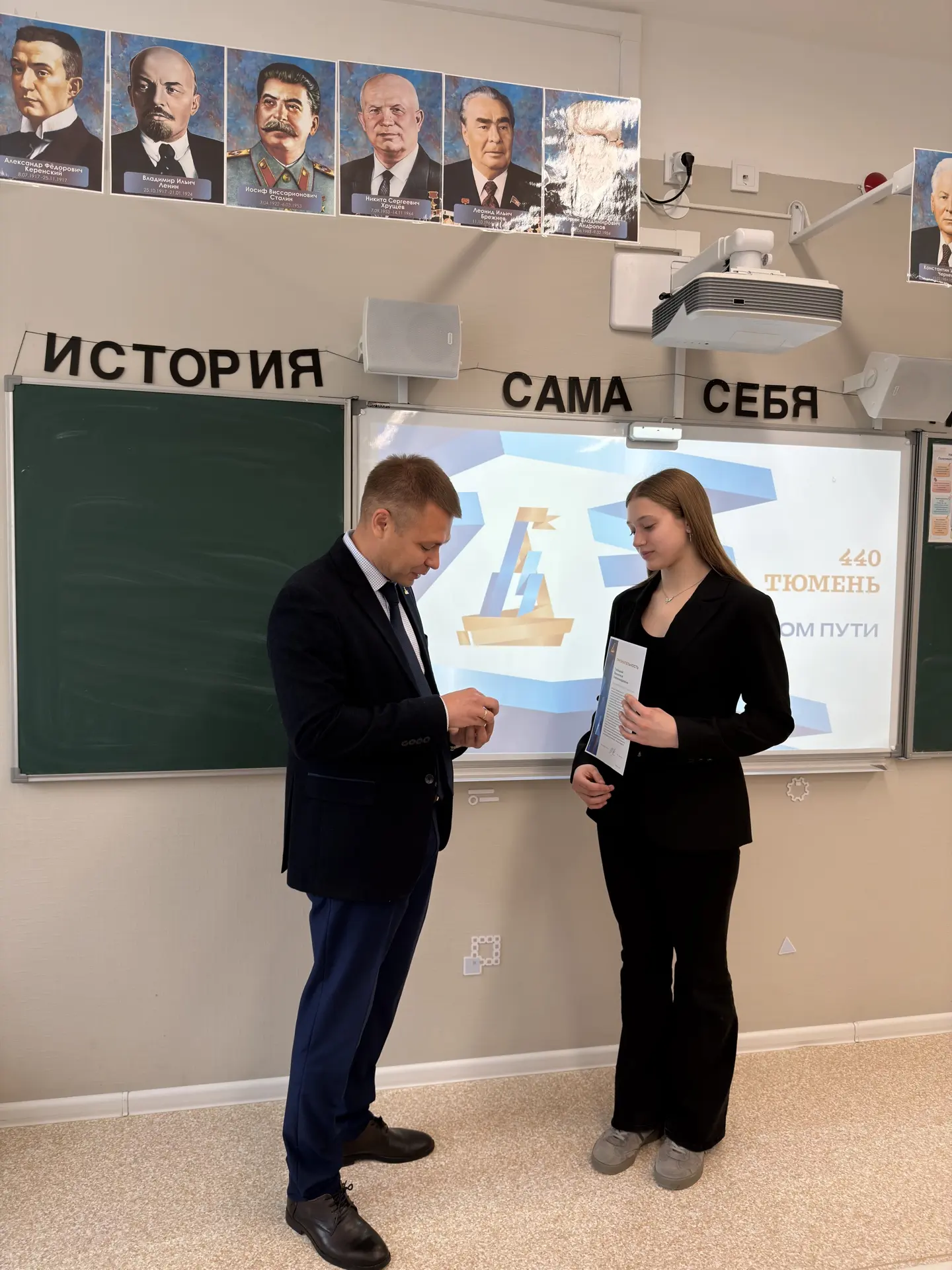 Заместитель руководителя управы Ленинского округа провёл открытый урок по местному самоуправлению и вручил благодарность юной спортсменке