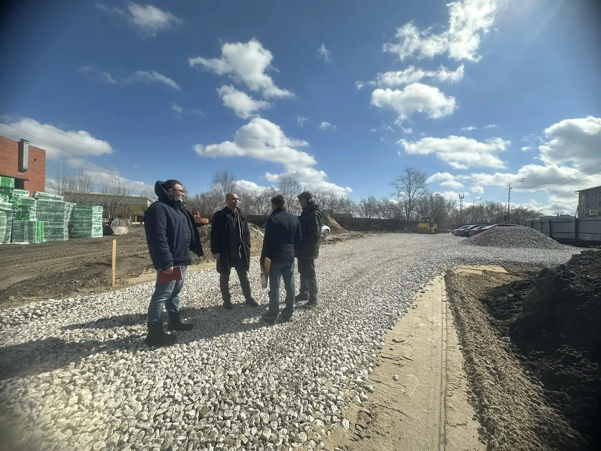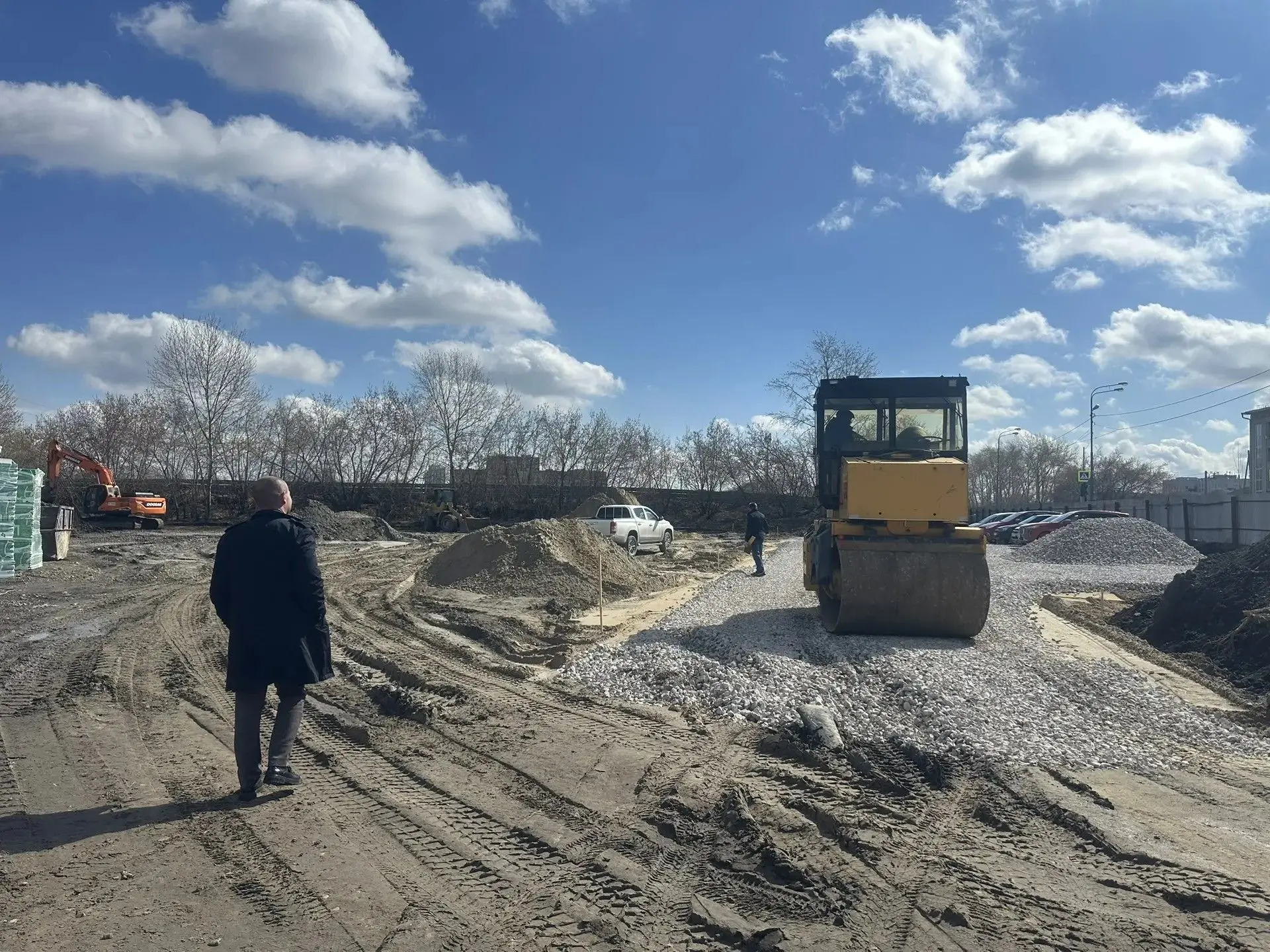 На сегодняшний день выполняется планировка территории и подготовка оснований под будущие покрытия, специалисты приступили к земляным работам по укладке кабеля освещения и фундамента под перголы.