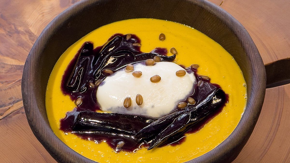 Теперь происходит сборка блюда: на глубокую тарелку выкладывается пара столовых ложек отваренной пшеницы, сверху наливается свежеприготовленный морковный крем, а завершающим аккордом станут яйца пашот. Для украшения подойдут соломки обжаренной моркови, которые добавят не только визуальную привлекательность, но и насыщенность вкуса.