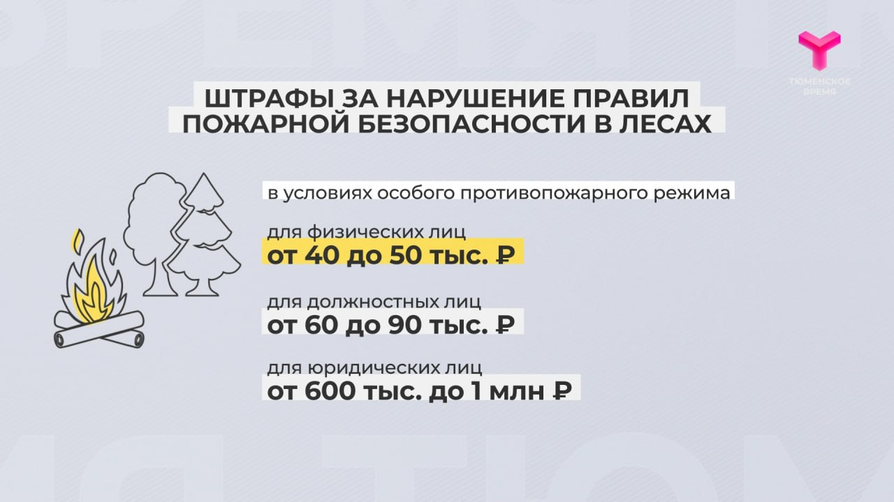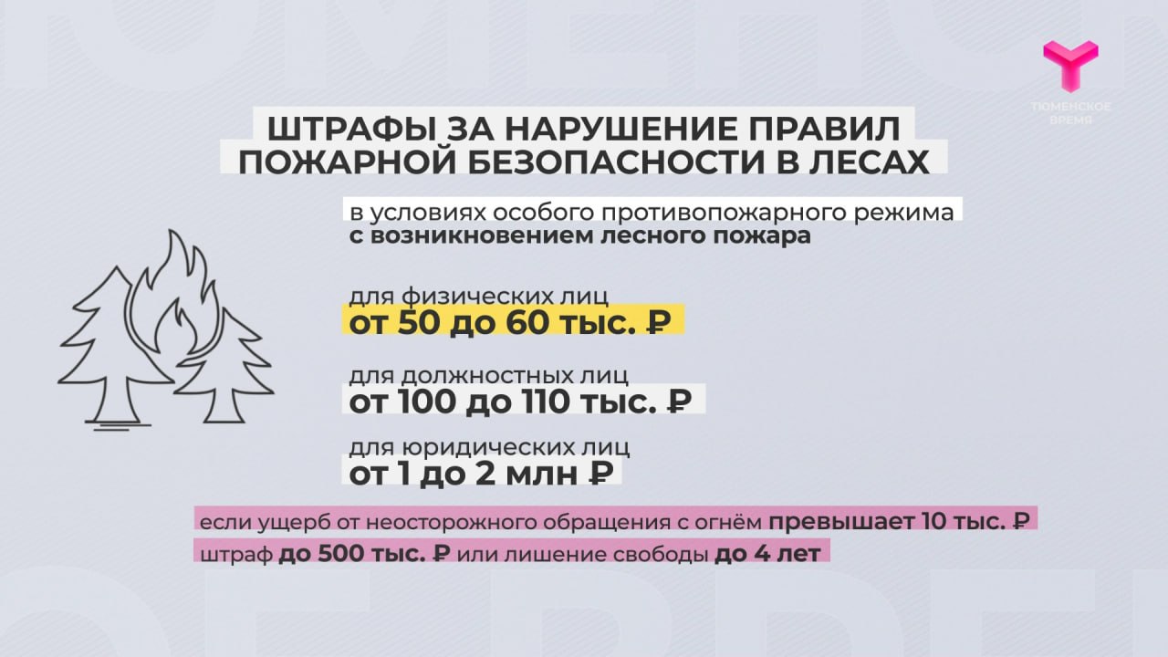 В условиях введения особого противопожарного режима штрафы вырастают. Для граждан до 50 тысяч рублей, для должностных лиц- до 90 тысяч, юрлицам до миллиона рублей.