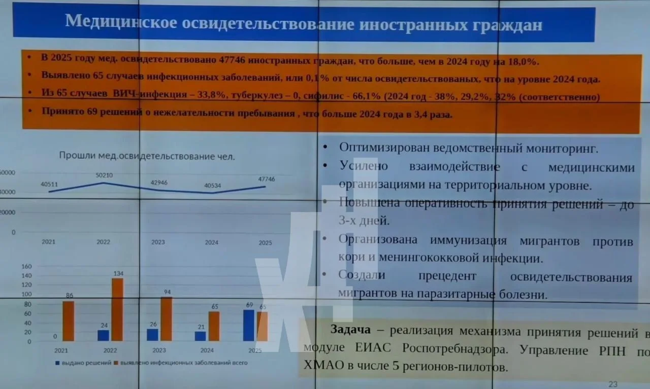 Сифилис и ВИЧ у мигрантов стали одной из причин их депортации из ХМАО. С этим связаны треть депортаций, остальные — с ЗППП и другими неприятными инфекциями. В 2025 году Роспотребнадзор Югры принял 65 решений о нежелательности пребывания иностранцев в регионе.