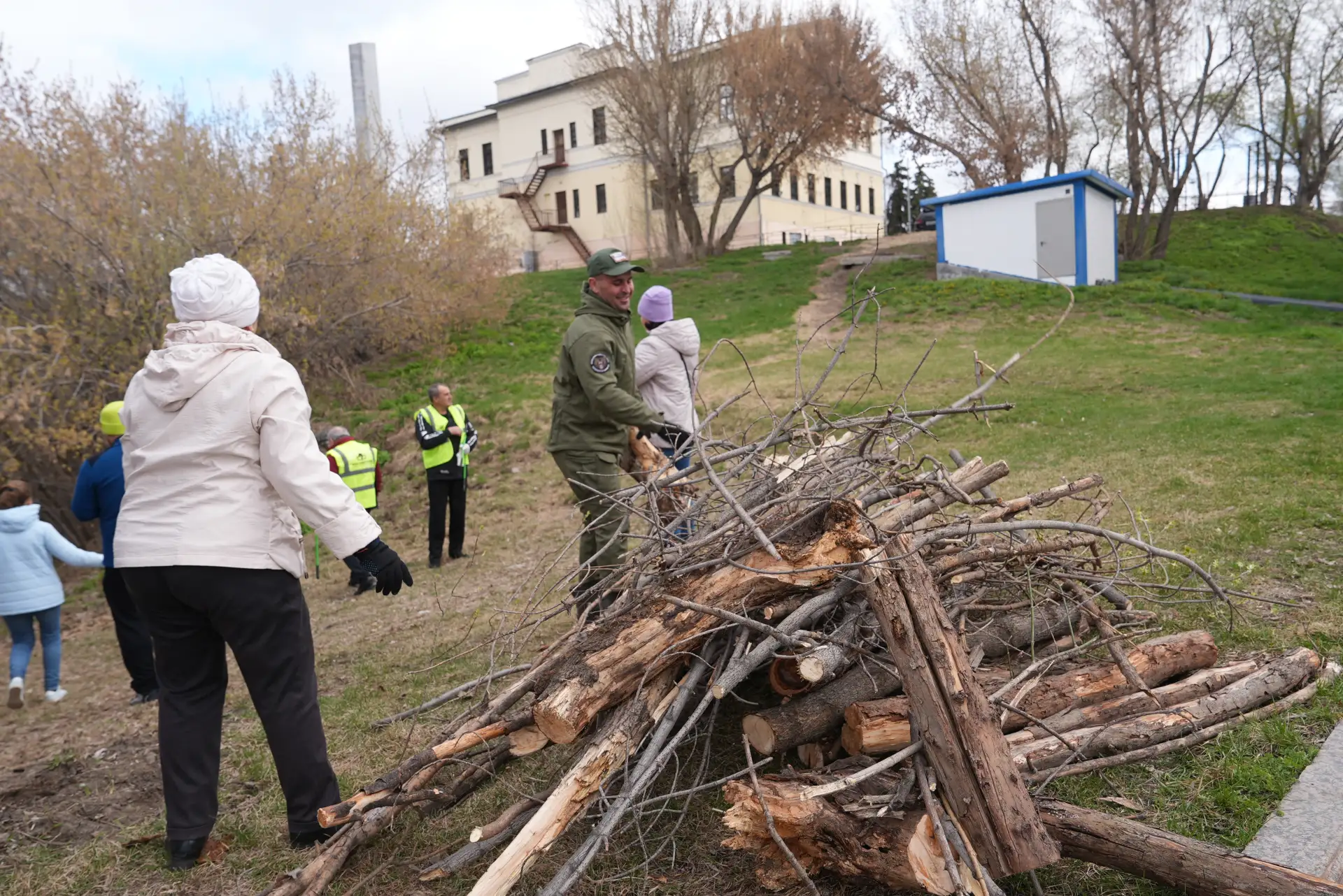 Тальчук Людмила Сергеевна, председатель Совета ветеранов Калининского административного округа, и Белан Любовь Викторовна, председатель Совета ветеранов завода ГМС «Нефтемаш», принялись убирать ветки и молодую поросль.