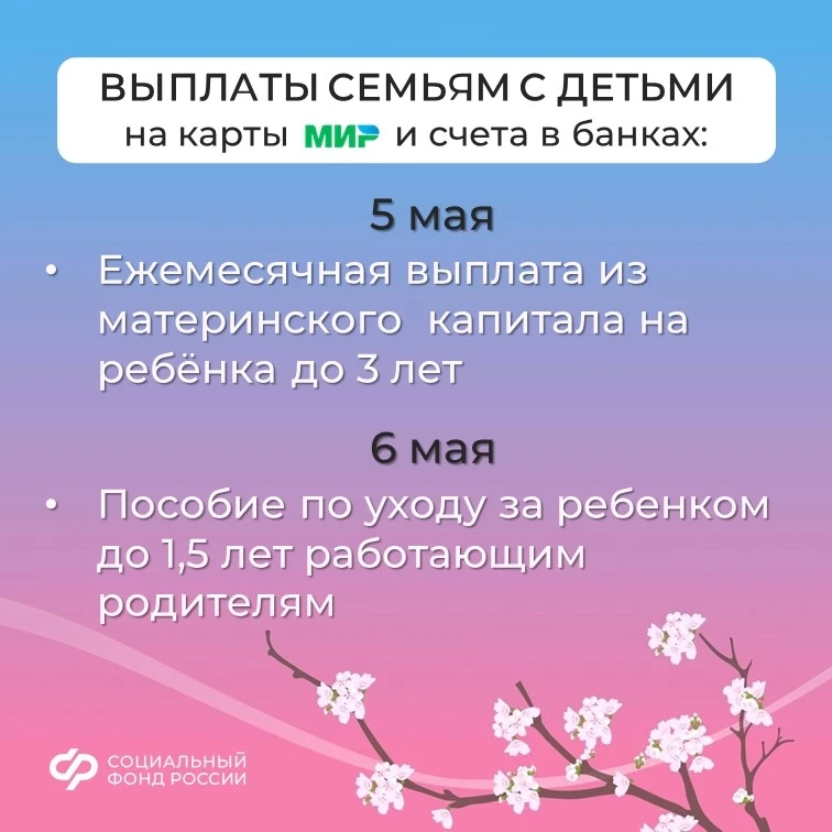 • 5 мая – ежемесячная выплата из средств материнского капитала на ребёнка до 3 лет;