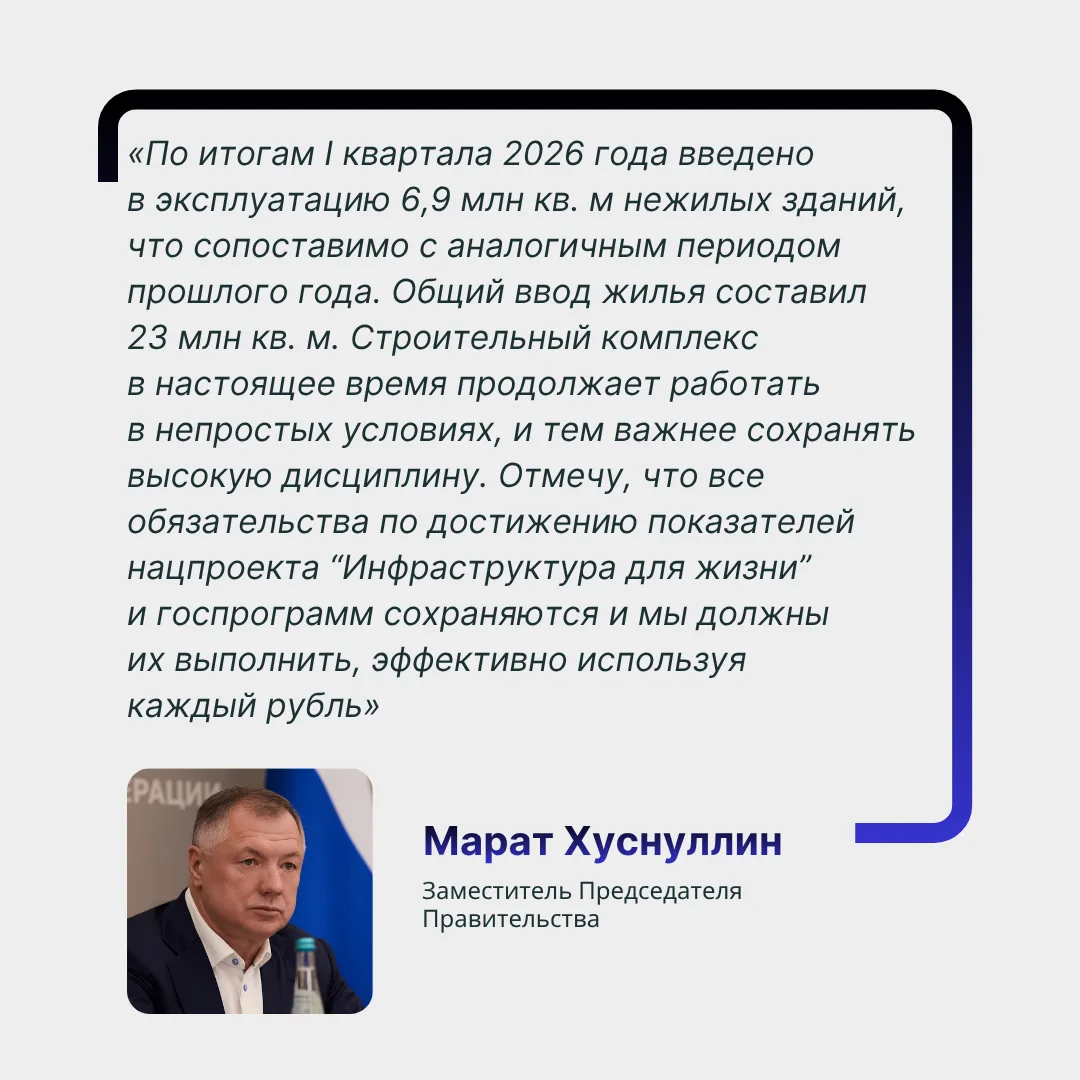 Министр строительства и ЖКХ РФ Ирек Файзуллин доложил о вводе объектов в рамках нацпроекта "Инфраструктура для жизни" и комплексной госпрограммы "Строительство". В 2026 году завершено благоустройство 533 территорий, а также реализовано 52 проекта — победителя конкурса лучших проектов создания комфортной городской среды.