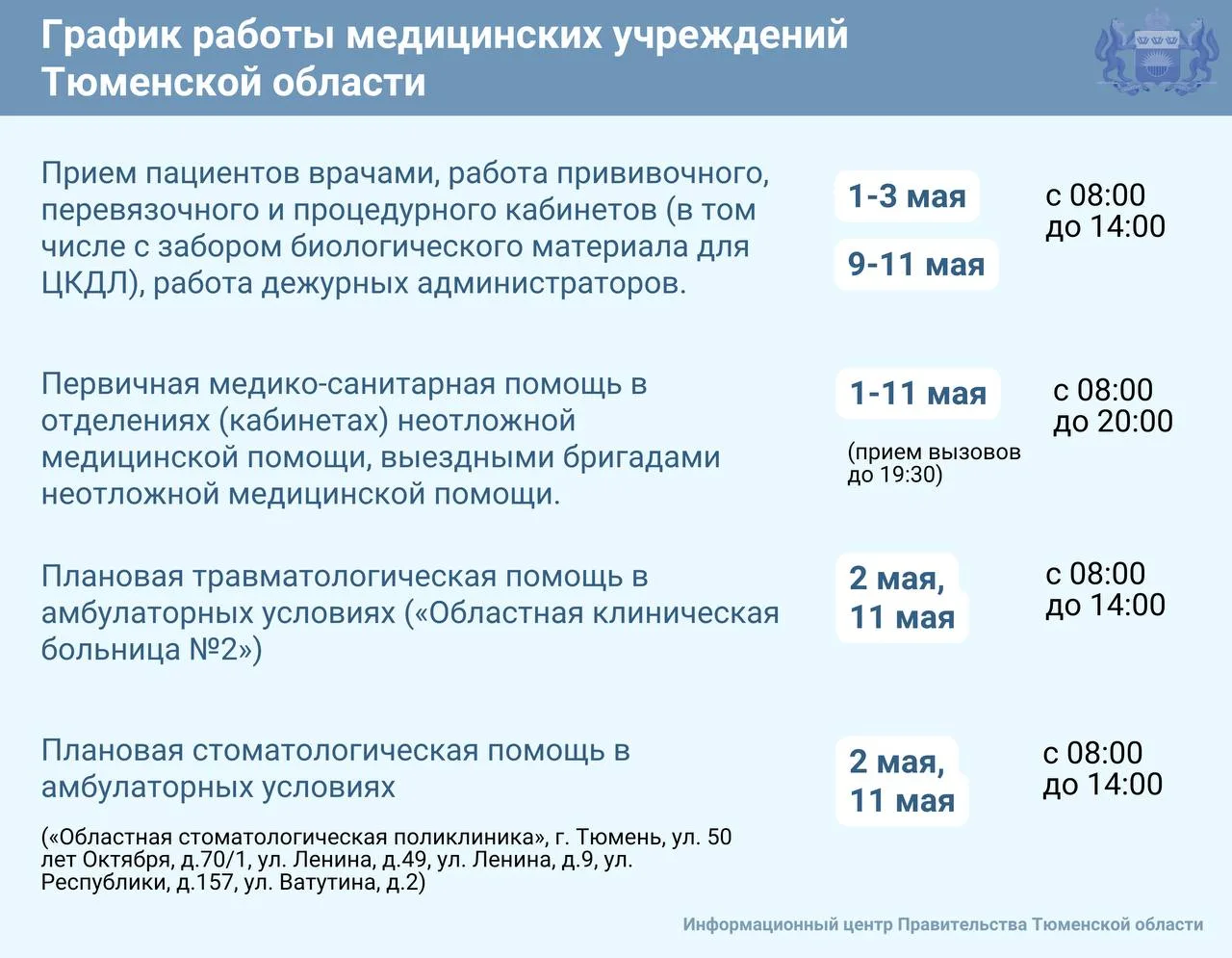 График работы медучреждений Тюменской области с 1 по 11 мая