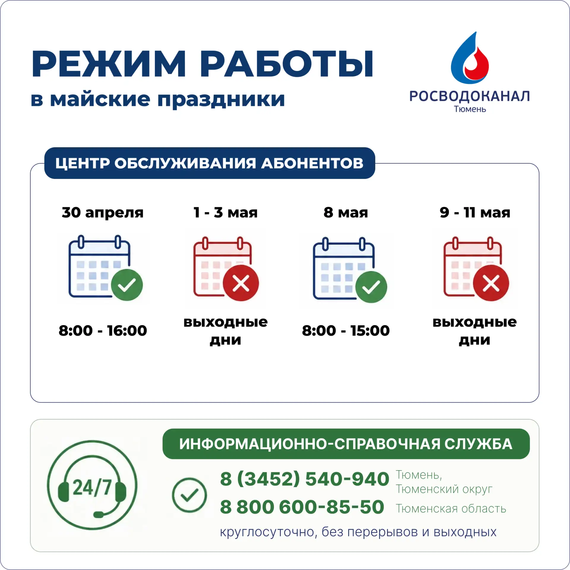 «Росводоканал Тюмень» подготовился к работе в майские праздники