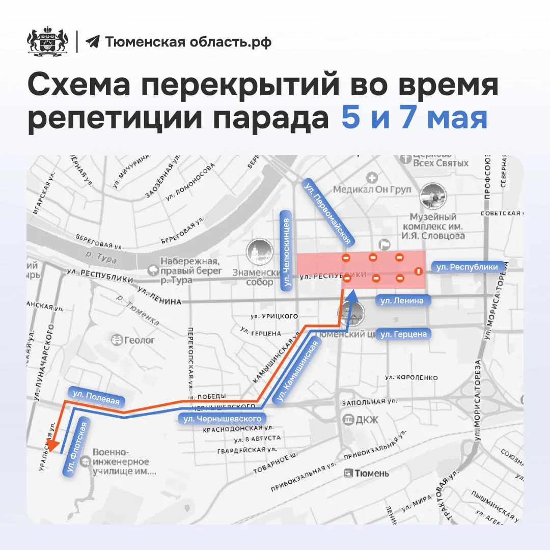 В центре Тюмени 5 и 7 мая ограничат движение транспорта